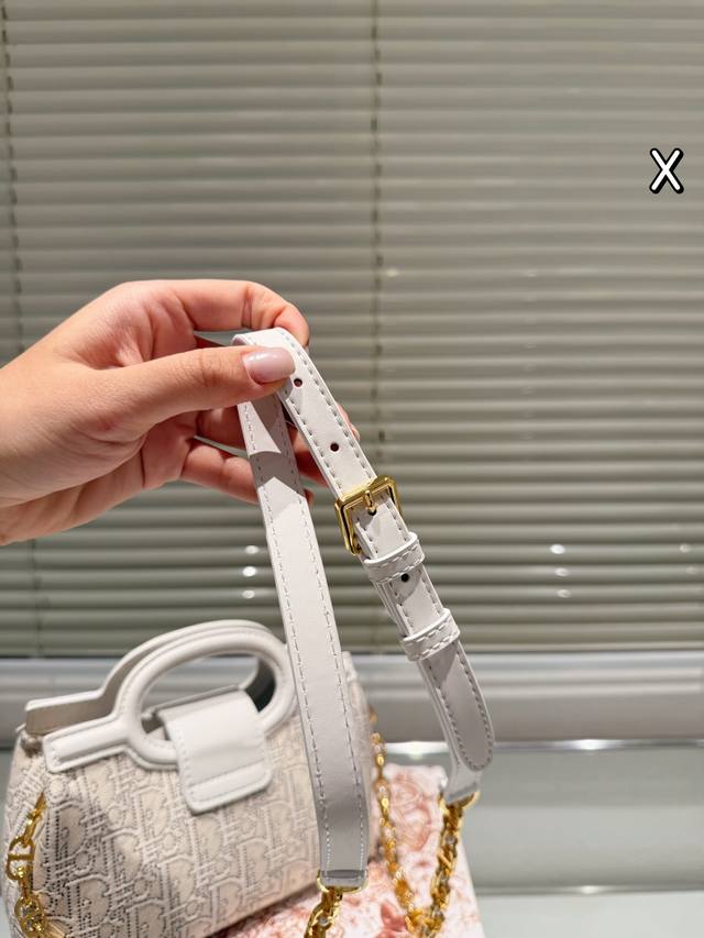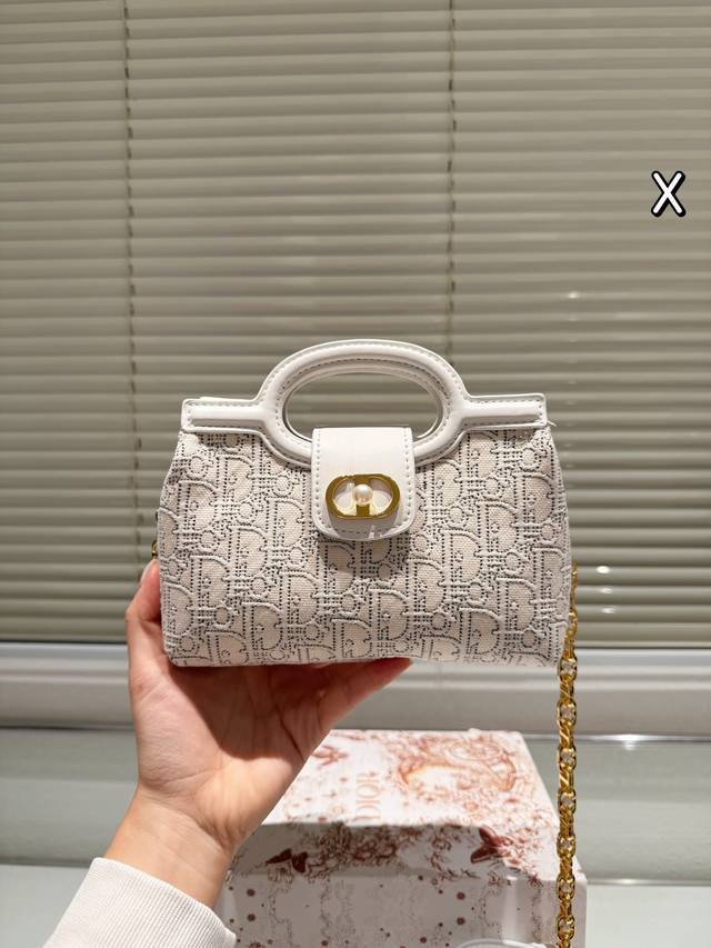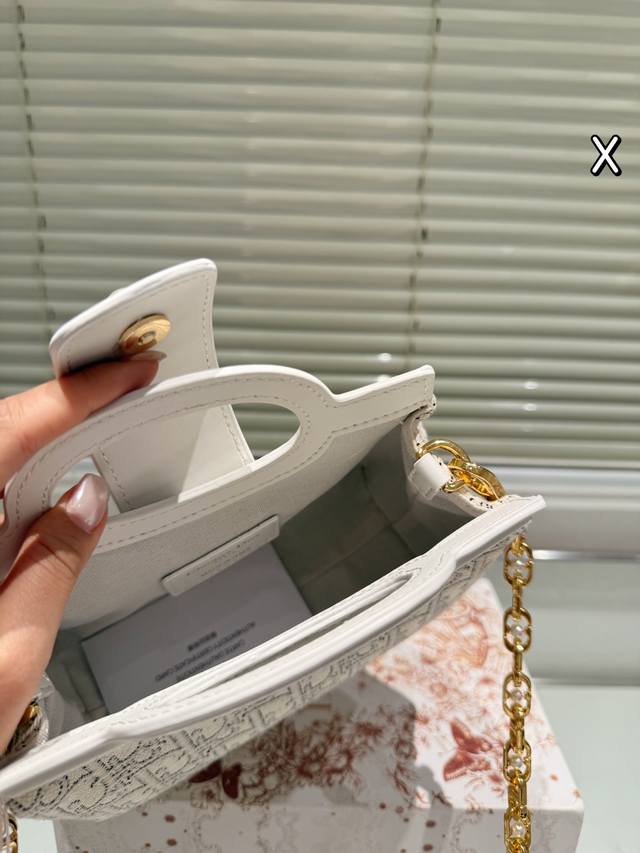 复刻版 DDD Dior Jolie Top Handle Fz DDD 迪奥Jolie Top Handle手袋,白色羊皮+藤格纹缝线, DDD 金色Cd标志+珍珠链条,优雅精致。尺寸 18.5X8.5X13Cm,内部有隔层,收纳日常物品无压力。双顶部手柄+可调节肩带,手提、单肩、斜挎都Ok,通勤约会都能轻松驾驭凸。羊皮柔软耐用,需定期保养避免划痕。白色款百搭,简约或正式穿搭都很出彩,轻松提升气 DDD 质。 DDD