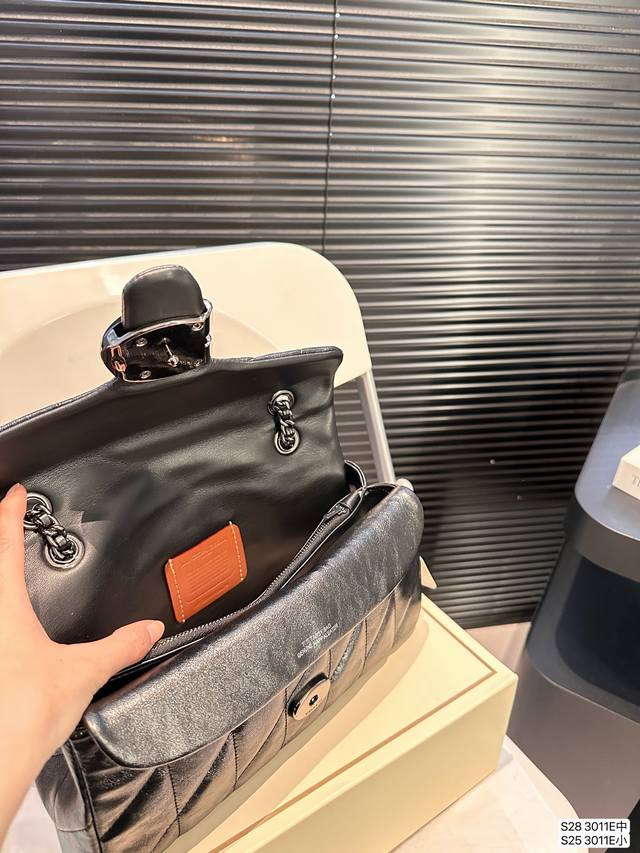 卡扣闭合设计,替代以往的磁吸扣,更加安全稳固包身侧面采用整面皮革衔接,整体包身线条更圆润饱满
