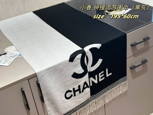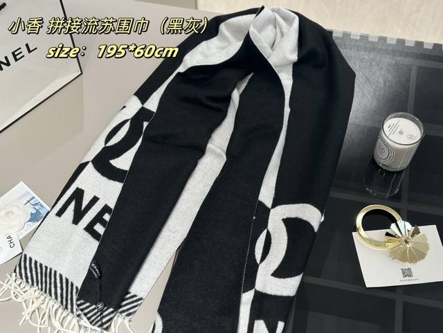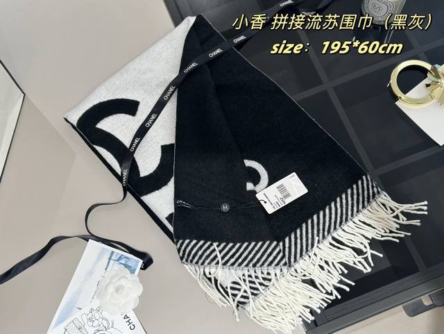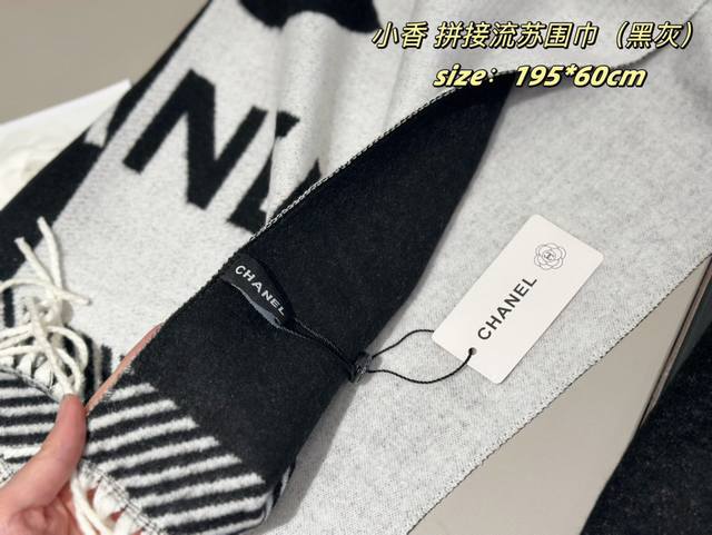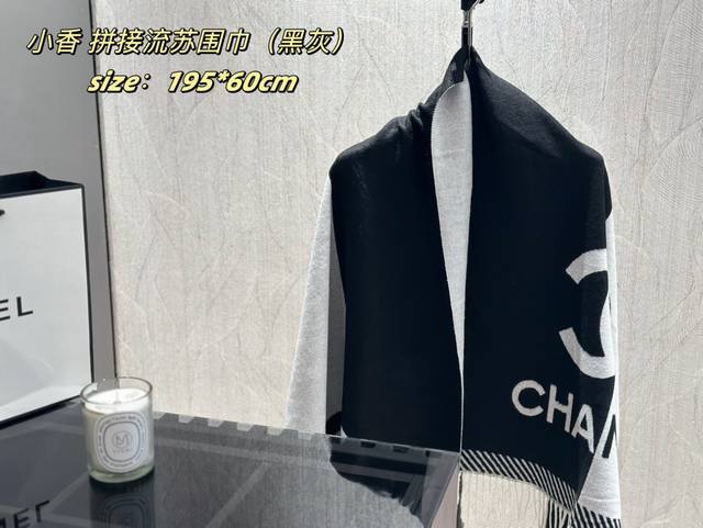 / 爆款围巾现货 配密封丝带礼盒 小香 24A 拼接流苏围巾 拿在手里软软糯糯的感觉 喜欢简单搭配就来这个哦 上身高级 没有廉价感 尺寸:195*60Cm