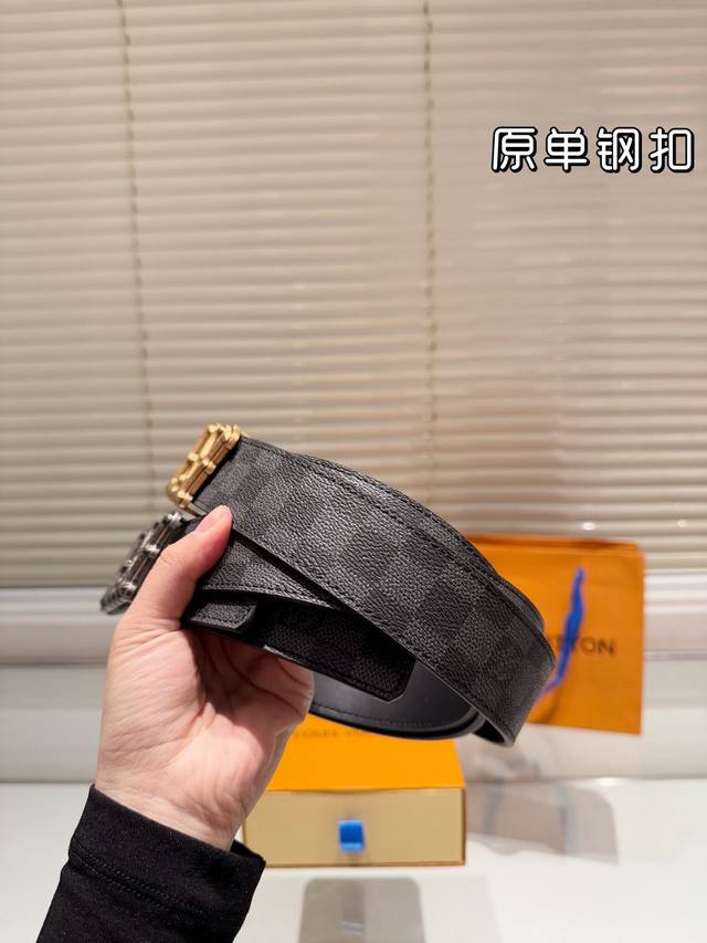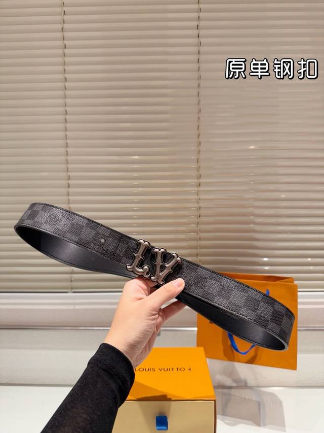 钢扣 高版本!腰带lv牛皮皮带~热门款 男女通用皮带里面最火的版本啦~质量很好 全套包装!五金绝对不褪色 皮带头和专柜一样的哦~ 配礼盒手提袋发票