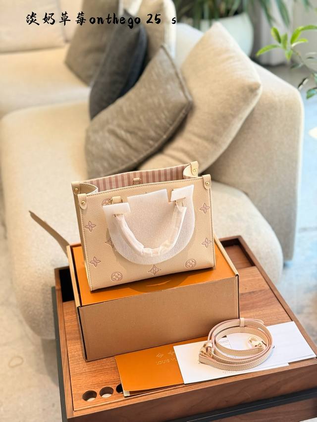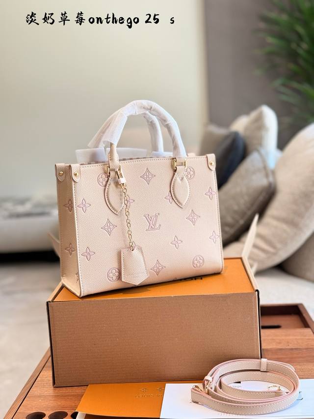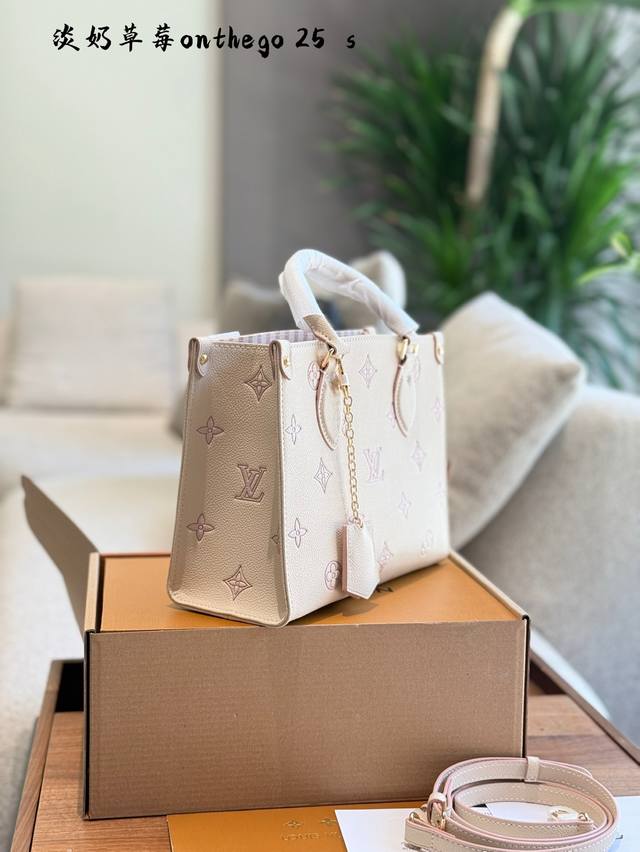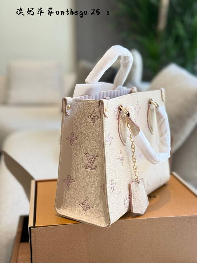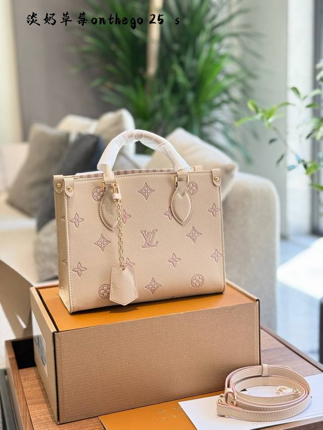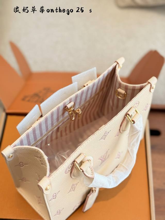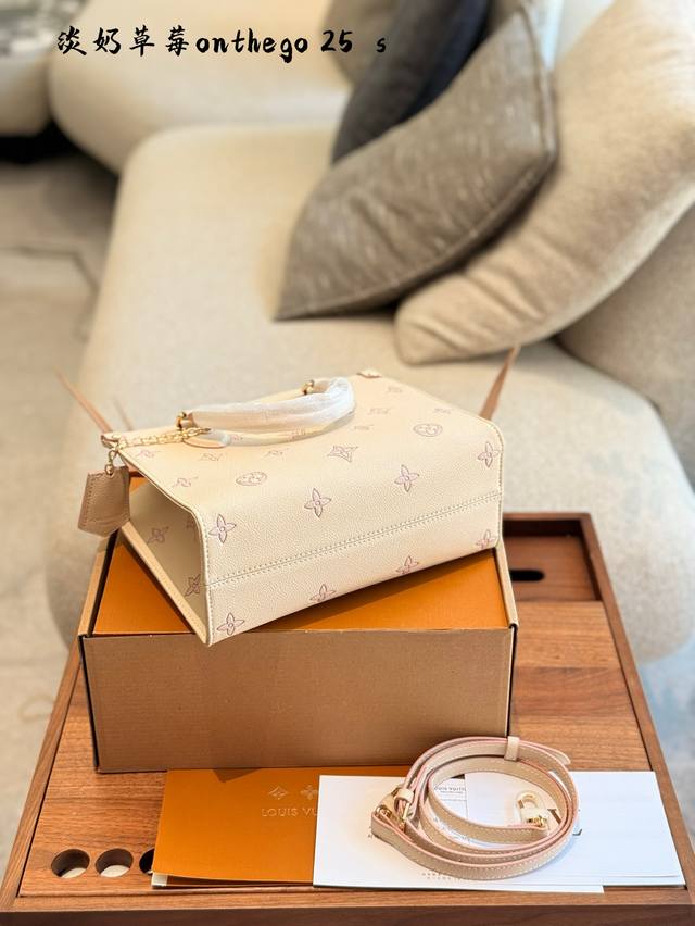lv 5月新款淡奶草莓Onthego托特包经典包型新配色 托特包真的好好看~ 自带挂件超适合小甜妹 手拎单肩斜挎都可以~25Cm配盒子
