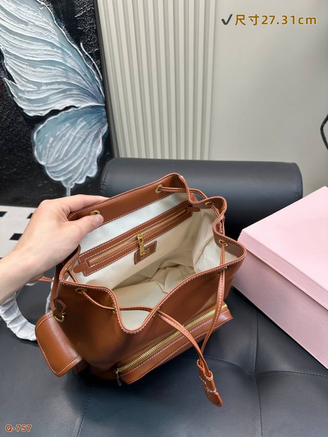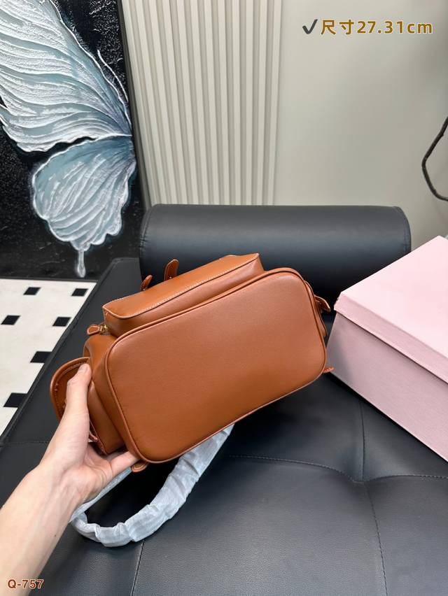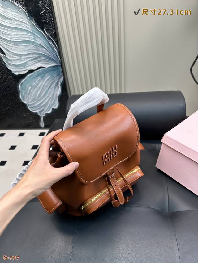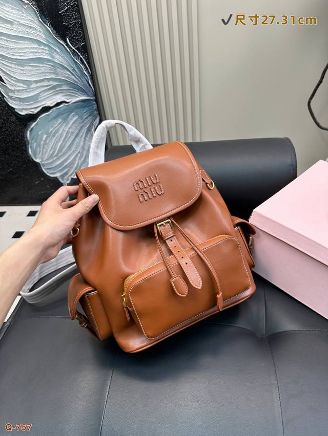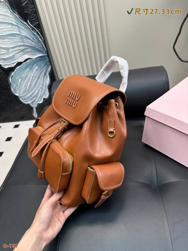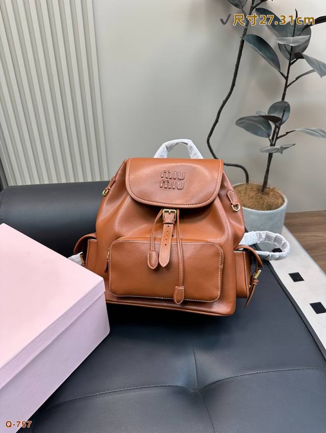/ 缪缪Miumiu这款皮革双肩背包采用校园风设计 采用让人想起童年 融合精湛工艺与休闲态度 别致的多口袋设计彰显Miu手袋的时尚趣致精神 尺寸27.31Cm