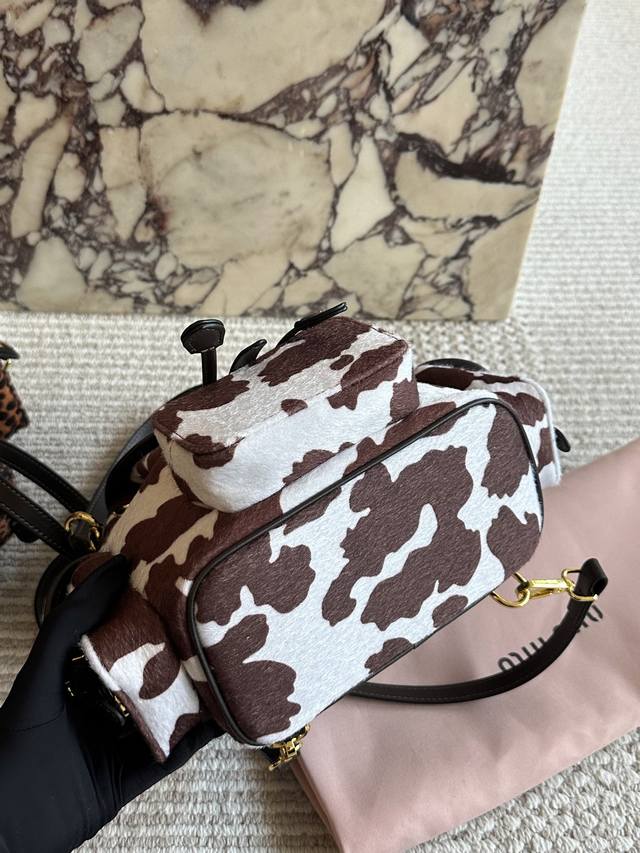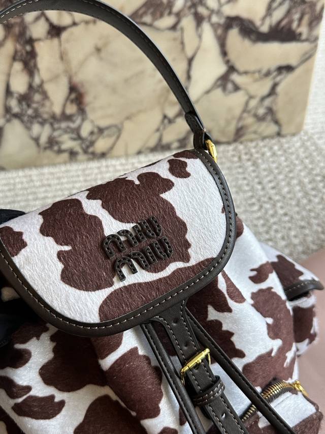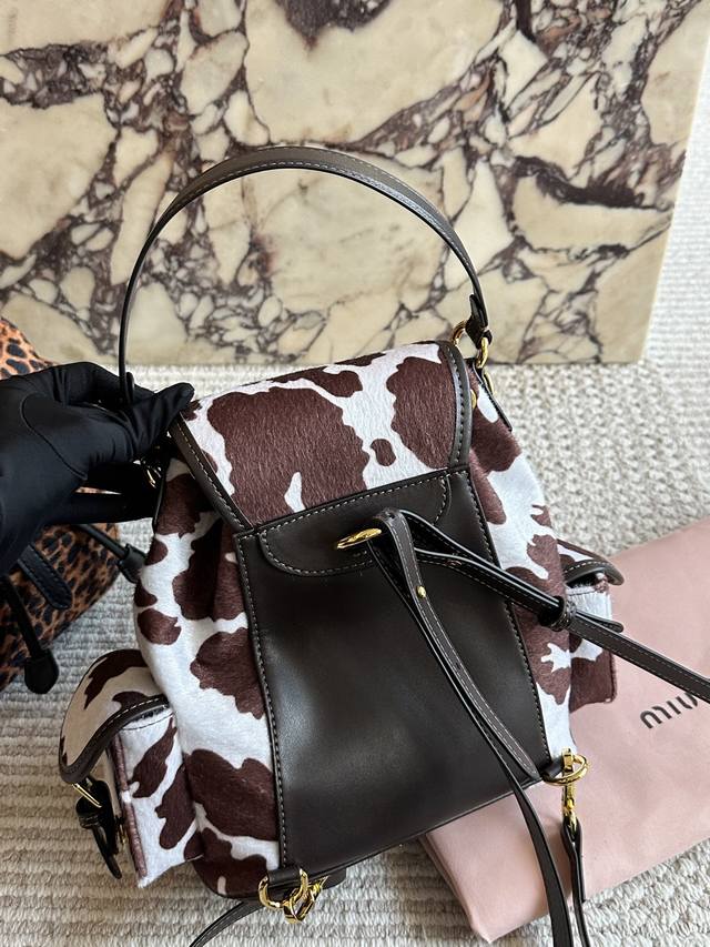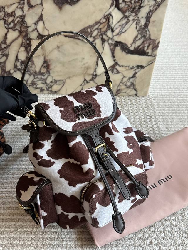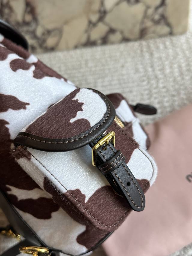 Miu Miu奶牛纹马毛双肩包 否Miu Miu 2025秋冬限定奶牛纹马毛双肩包,棕色与白色撞色,复古又俏皮马毛环保皮草材质,触感柔软,秋冬季节超适合见。迷你