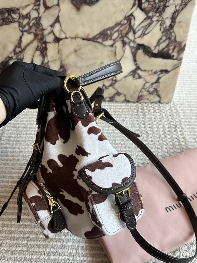 / Miu Miu奶牛纹马毛双肩包 否Miu Miu 2025秋冬限定奶牛纹马毛双肩包,棕色与白色撞色,复古又俏皮马毛环保皮草材质,触感柔软,秋冬季节超适合见。迷你