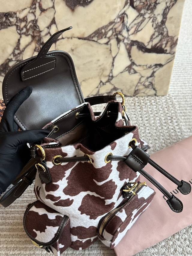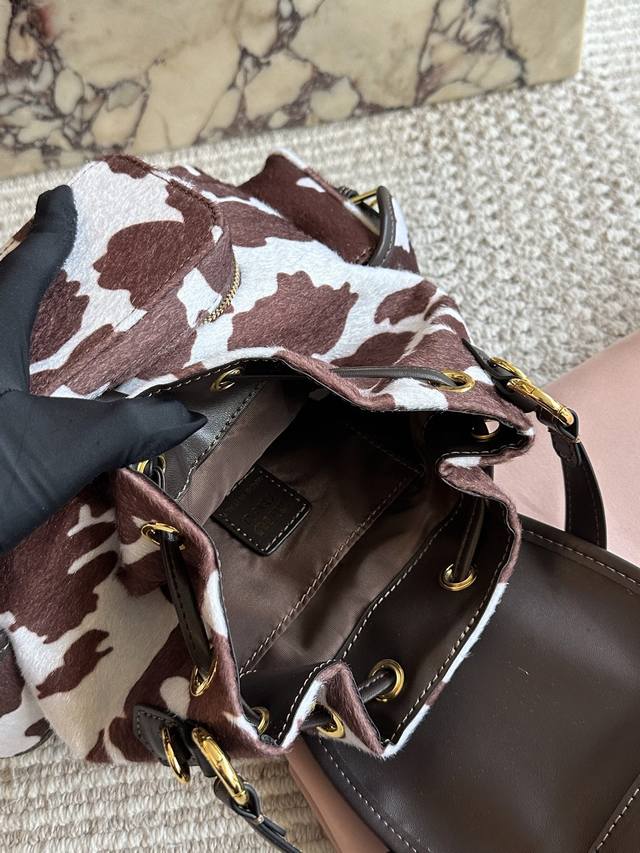 Miu Miu奶牛纹马毛双肩包 DDD 否Miu Miu 2025秋冬限定奶牛纹马毛双肩包,棕色与白色撞色,复古又俏皮马毛环保皮草材质,触感柔软,秋冬季节超适合见。迷你尺寸,轻便实用,通勤或短途出行都能轻松驾驭。抽绳+翻盖设计,安全又有层次感,内部空间合理,日常必需品轻松收纳日。搭配简约服饰,瞬间提升造型趣味与个性*+。20×23 DDD