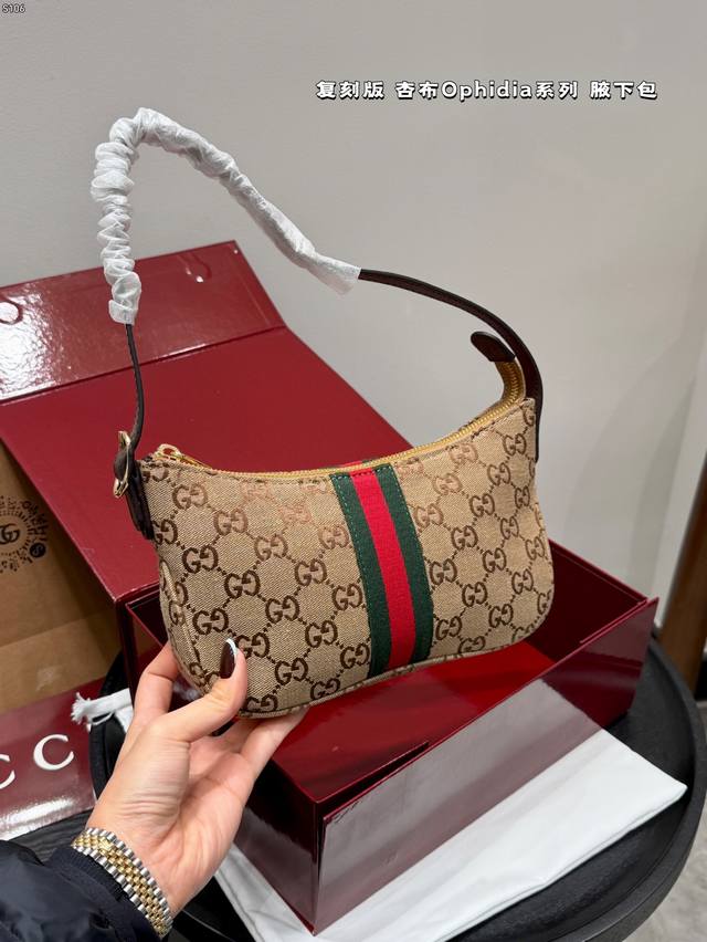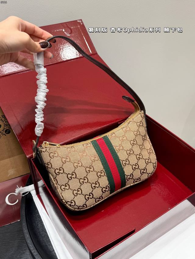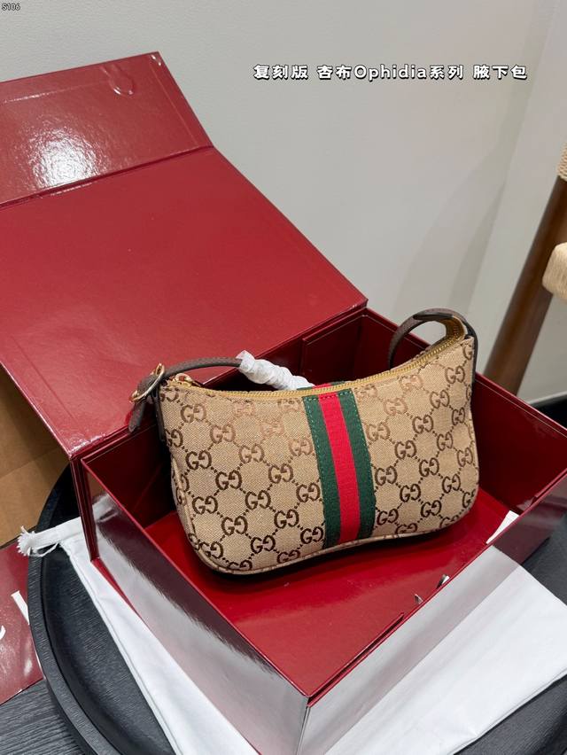 礼盒包装 复刻版 Gucci Ophidia系列迷你Hobo腋下包 米色杏布帆布+双G织带,红绿织带超有辨识度。拉链开合更安全,小巧尺寸,手提肩背都Ok,通勤休