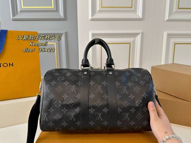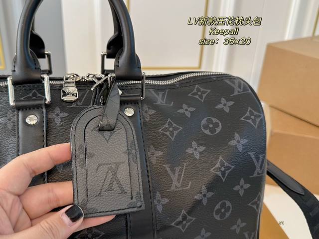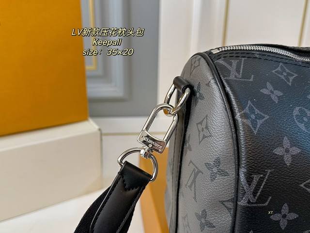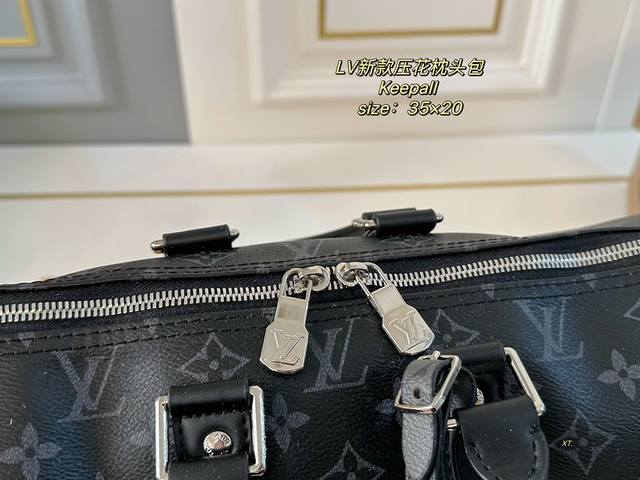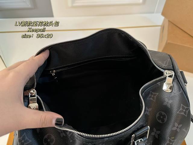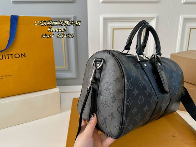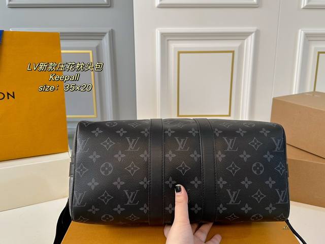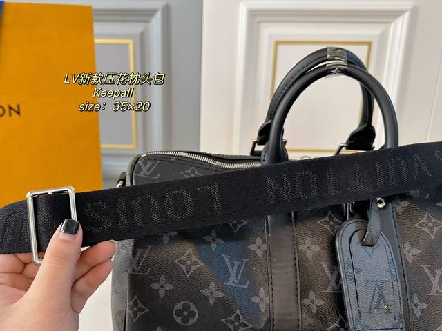 配盒 Size:35×20 Lv路易威登新款压花keepall枕头包 全黑色老花低调又耐看, 容量观,手提斜挎都无压力! 时尚前卫,男女同款又酷又飒