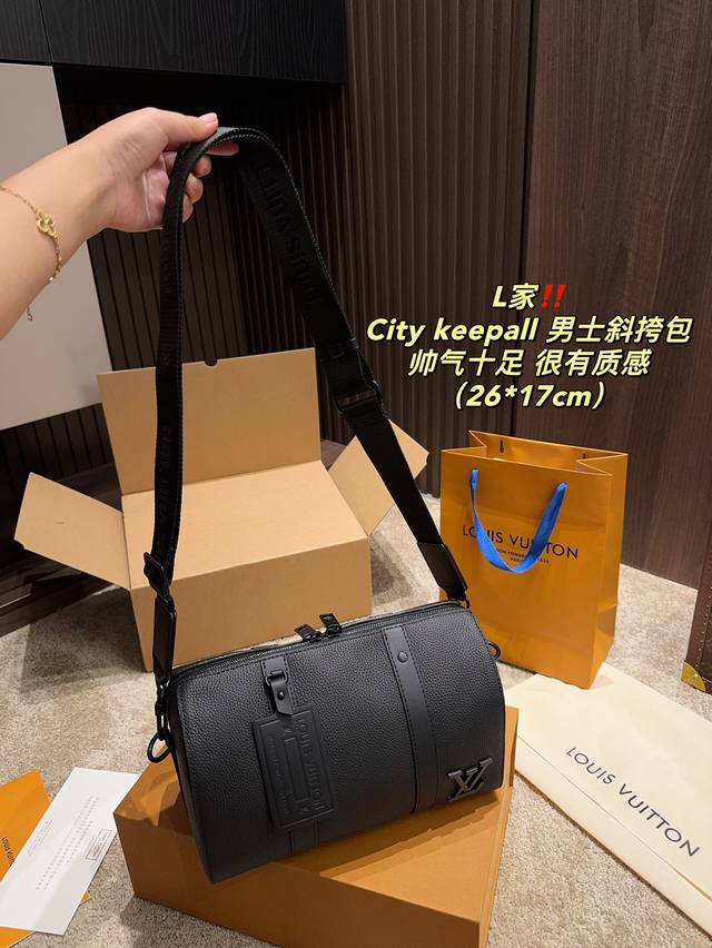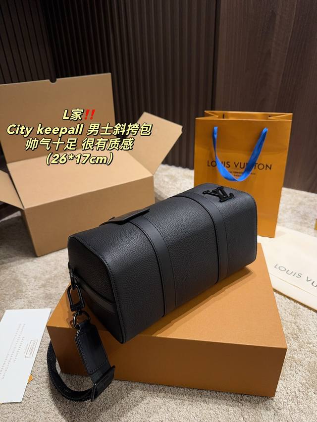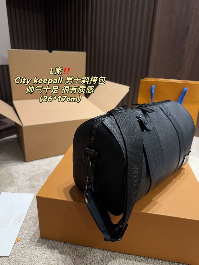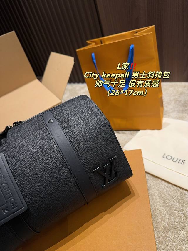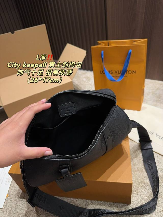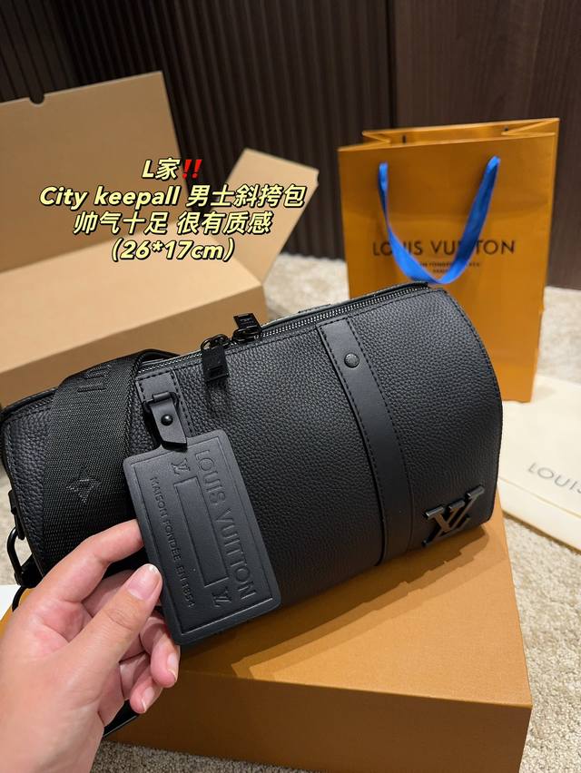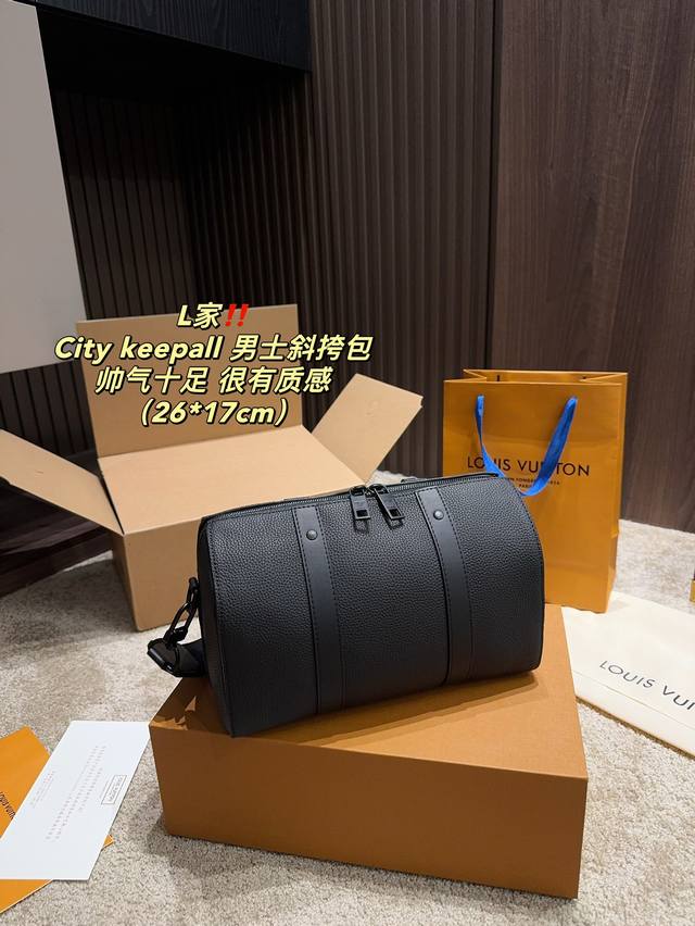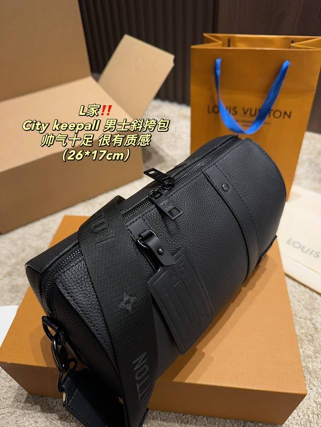 / 全套包装尺寸26.17 Lv City Keepall 男士斜挎包 超级百搭耐装,牛皮材质,硬挺不会软趴趴,空问很大很耐装,完肩带也不压 肩膀,很火的黑色老花