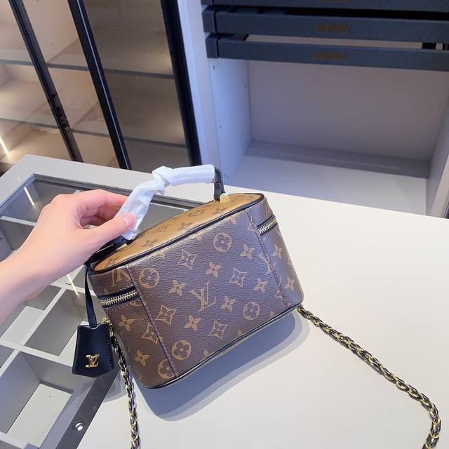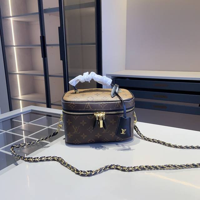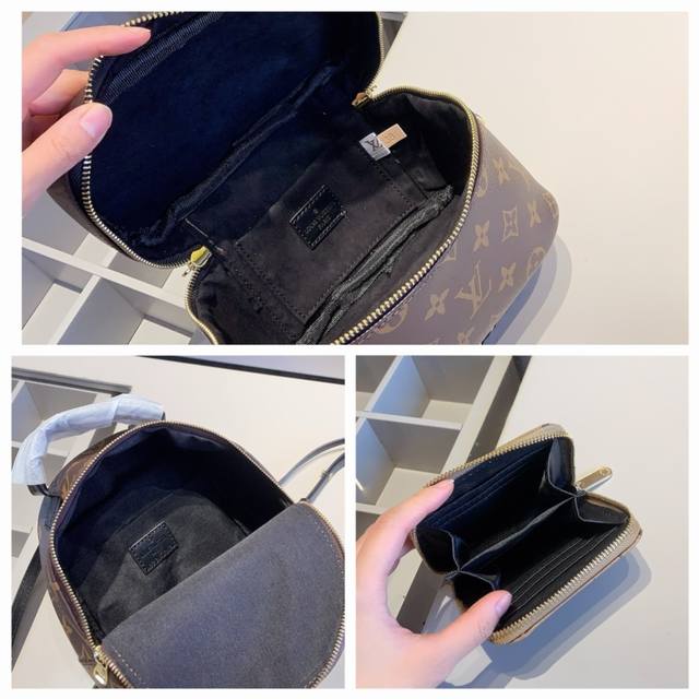 产品介绍 L家专柜同款小箱子~老花拼色化妆箱!原版面料五金!原版品质搭配爆款老花小辣椒双肩包~可肩背~百搭实用!黄花系列小钱包小巧精致!