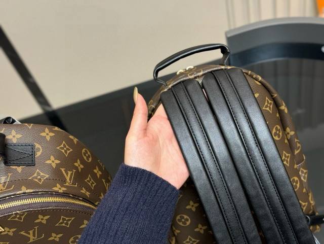 配包装 驴牌必如单品之一 Lv palm Springs 双肩包 各路网红都在背 顶部手把起鼓设计更具特色 肩带也是小牛皮的,线迹均匀一致 尺寸:23*27Cm