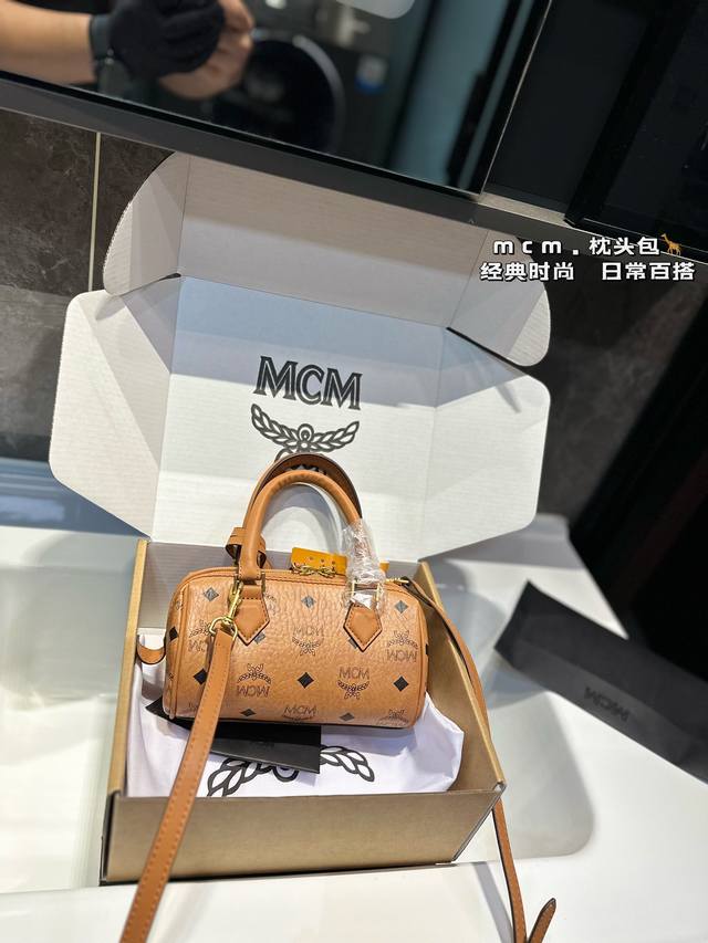 配礼盒 mcm Mini 波士顿枕头包 简单百搭 颜值高 日常出街首选 潮酷时尚女孩必入款尺寸 19*6*10Cm