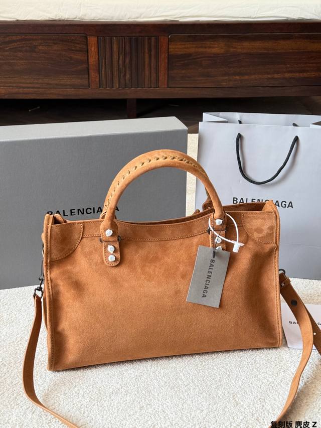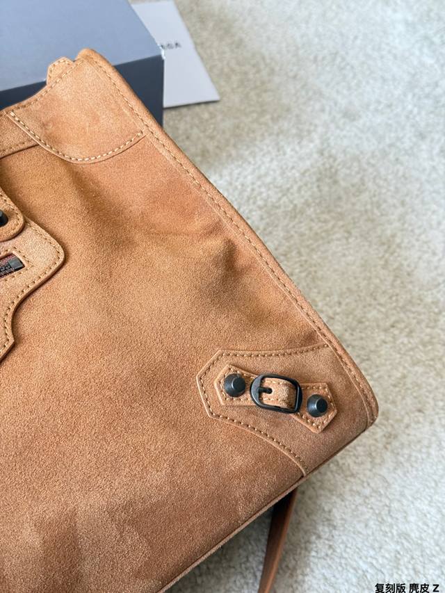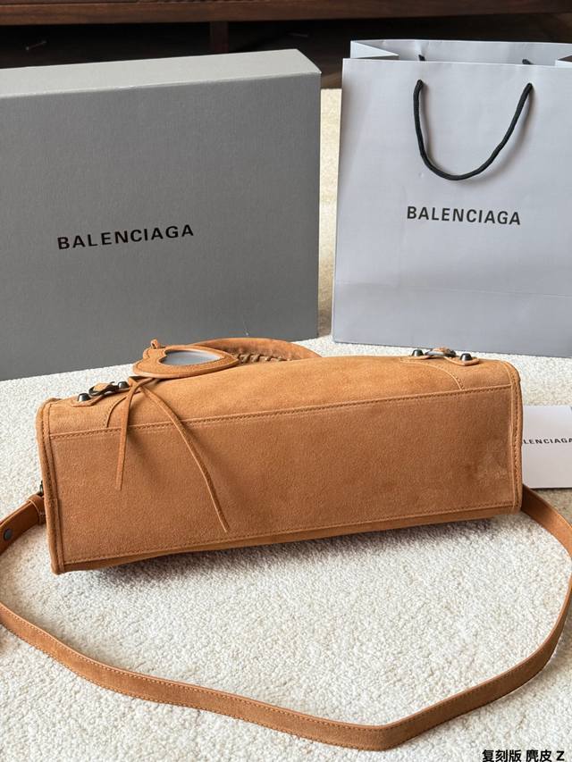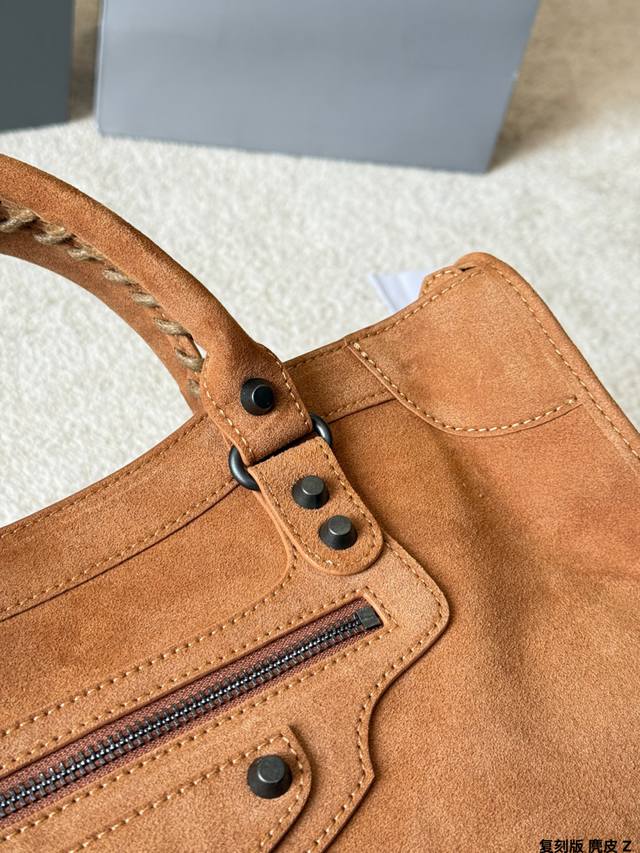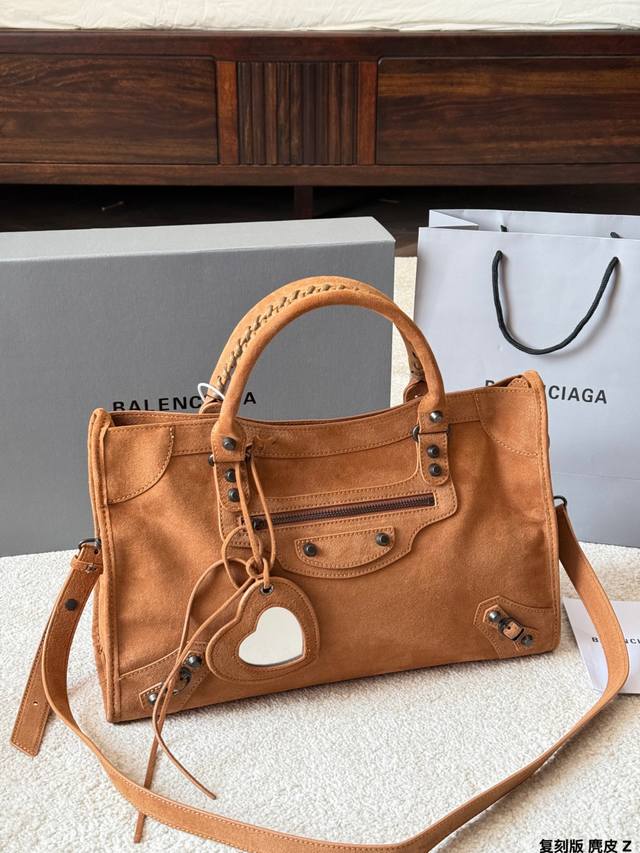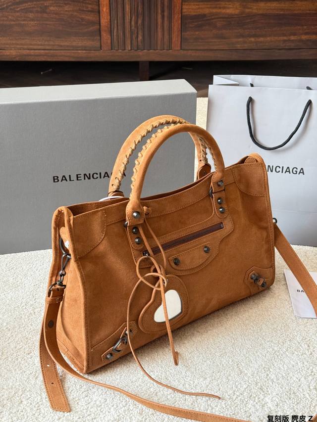 复刻版 麂皮 巴黎世家Le City麂皮机车包 巴黎世家Le City麂皮机车包,秋冬限定麂皮材质+金属铆钉,复古机车风超有态度!棕色包身配心形镂空,细节满分。手提+斜挎两种背法,容量大,通勤出街都Ok。麂皮柔软,秋冬搭配风衣大衣超有氛围感,实用又时髦,是秋冬必入热门单品! 尺寸 38 23Cm
