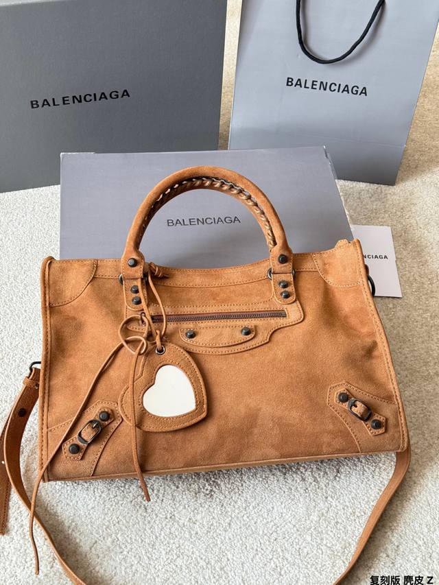 / 复刻版 麂皮 巴黎世家Le City麂皮机车包 巴黎世家Le City麂皮机车包,秋冬限定麂皮材质+金属铆钉,复古机车风超有态度!棕色包身配心形镂空,细节满分。