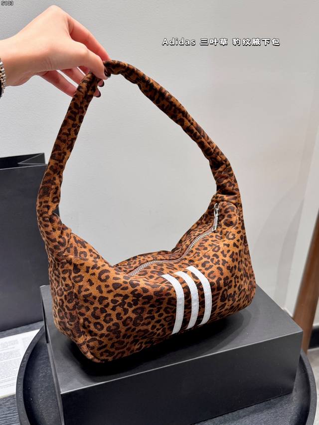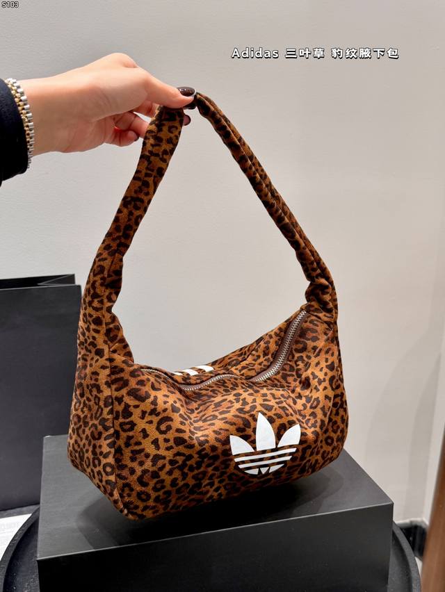 带盒子 Adidas阿迪达斯三叶草豹纹腋下包 阿迪达斯三叶草系列豹纹腋下包,帆布材质+经典豹纹,搭配白色三叶草标志,复古又时髦。包型小巧,容量适中,手机、雨伞、
