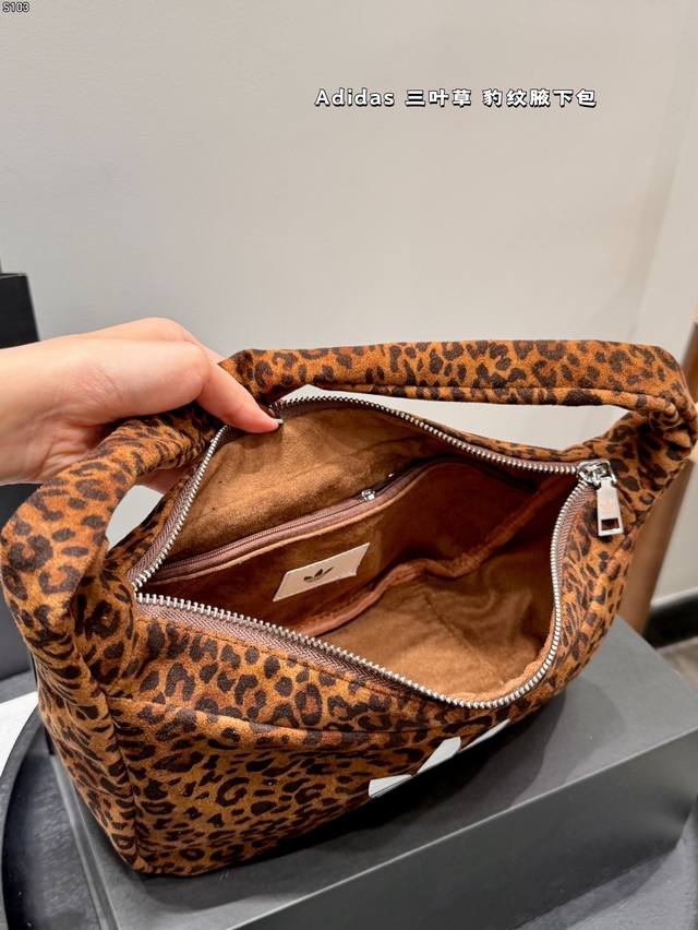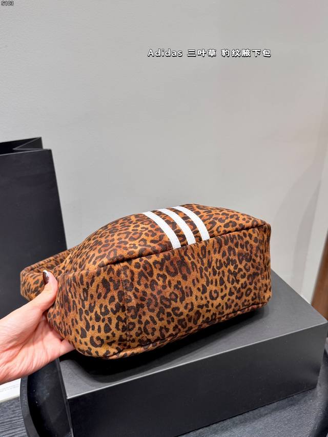 带盒子 Adidas阿迪达斯三叶草豹纹腋下包 阿迪达斯三叶草系列豹纹腋下包,帆布材质+经典豹纹,搭配白色三叶草标志,复古又时髦。包型小巧,容量适中,手机、雨伞、小风扇都能装下,通勤出街都很适合。腋下包设计轻便百搭,甜辣风、Y2K辣妹风都能轻松驾驭,是秋冬穿搭点睛单品,潮人必入! 尺寸 25 10Cm