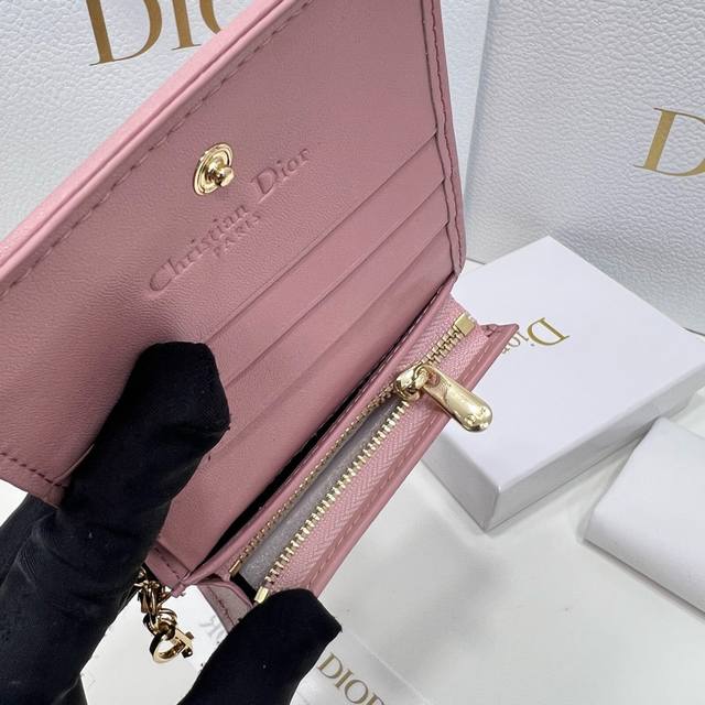 Dior 专柜新款出货!这款迷你 Lady Dior 钱包设计精巧,空间宽敞。黑色羊皮革饰以藤格纹缉面线和“D.I.O.R.”吊饰,打造时尚经典的造型。可收纳各种日常用品,可轻松搭配 Lady Dior 系列的其他单品,打造配套的造型。