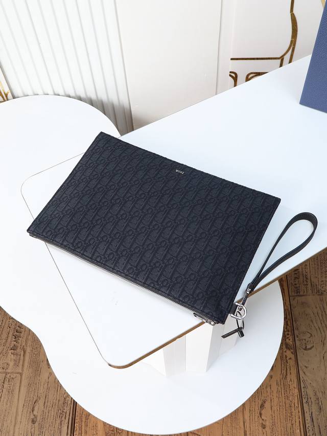 这款 A4 手拿包时尚简约 采用黑色 Oblique 印花面料精心制作 正面饰以 Dior 标志提升格调 拉链隔层设有两个插袋和四个卡槽 可手拿或放入手袋中