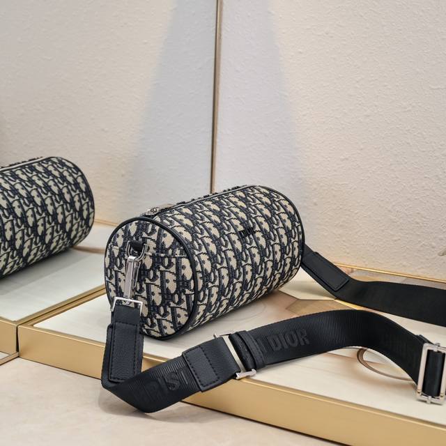 原版配虎头盒子 Dior 早春新款内有内码 Oblique 印花帆布圆筒包黑色布和黑色小牛皮可调节、可拆卸肩背带满Logo标志细节,男女同款。型号:Cd-108