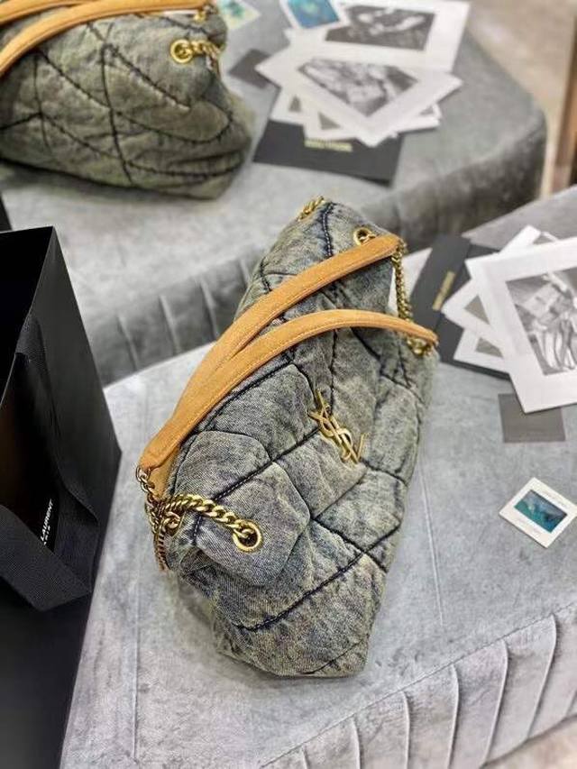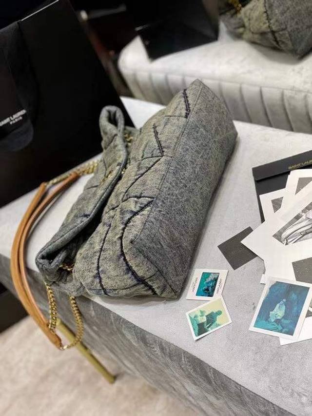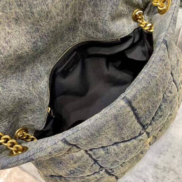 Loulou Puffer 牛仔布纹大号绗缝包,极致牛仔水洗工艺,手感柔软舒适,犹如怀抱云朵般的感受;经典的y家logo、链条及扣眼五金均采宗古铜金色五金,包袋开口处折叠后使用了磁性四合扣封口,密闭性及安全性一流;包内设有一个拉链内袋可放置手机及贵重物品,除此之外无多余内袋设计,使用起来随心所欲!