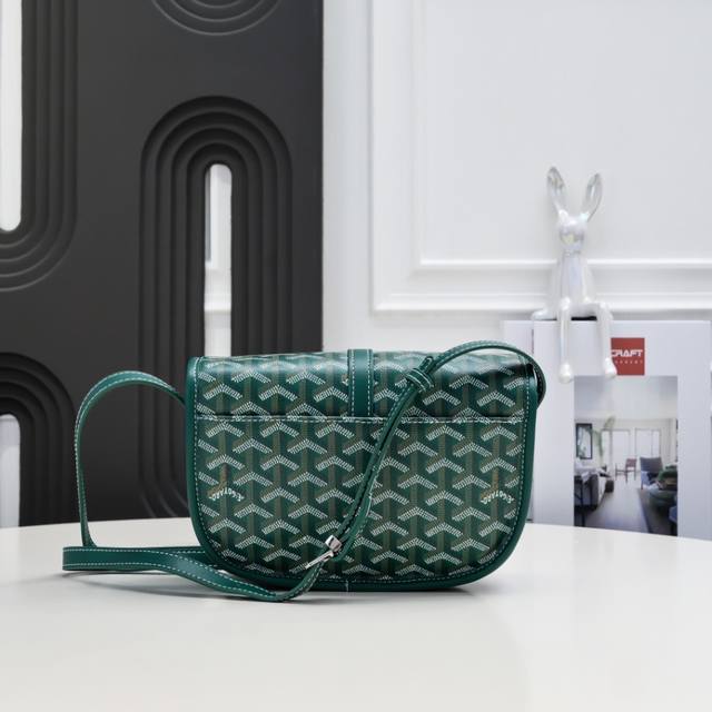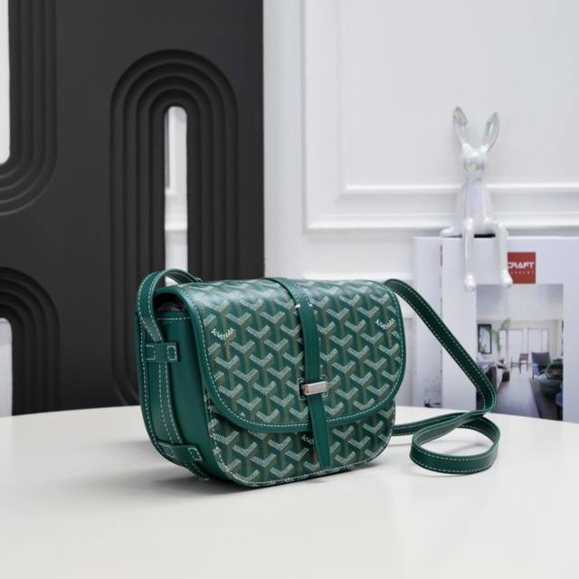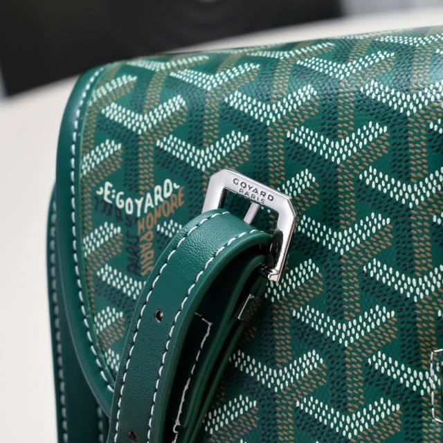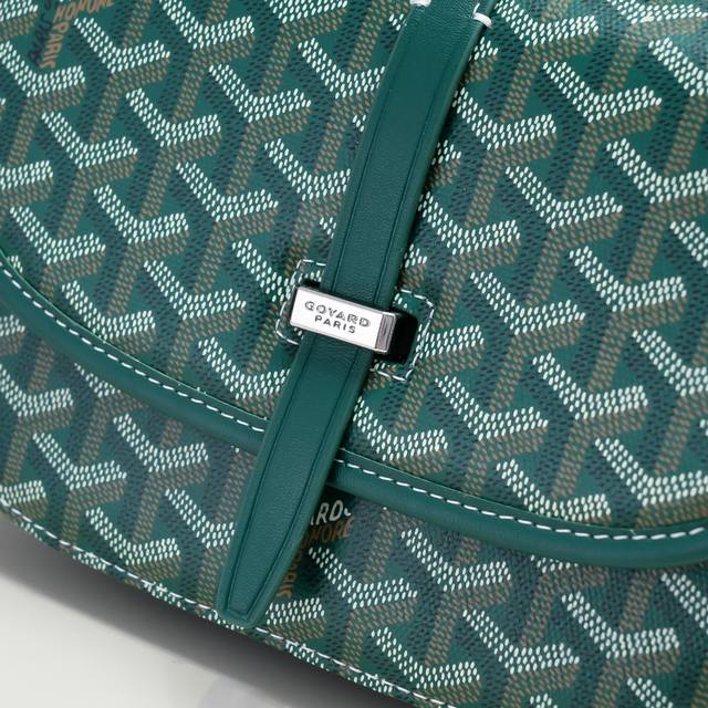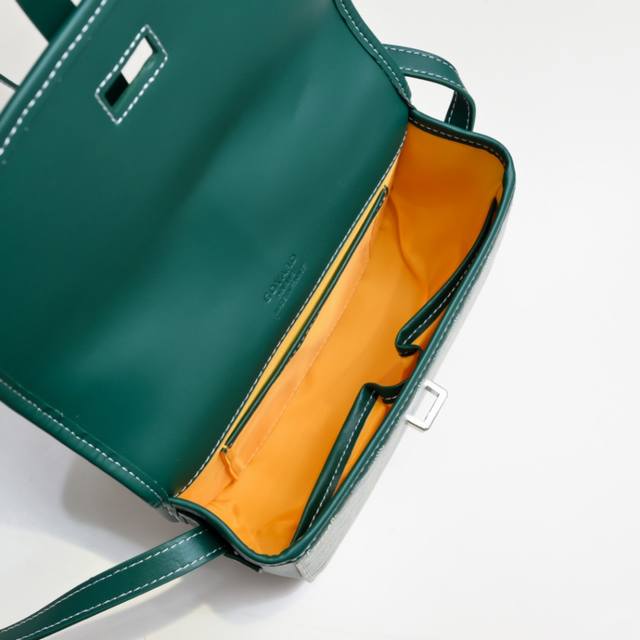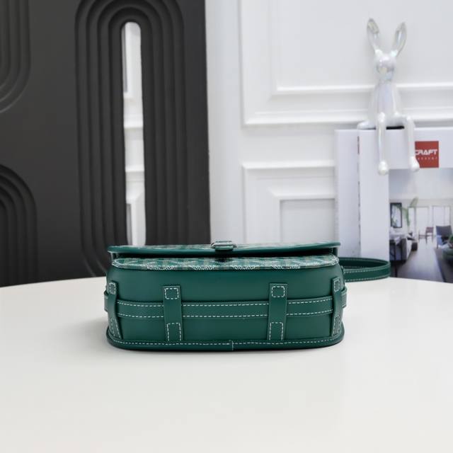 戈家 绿色 工厂P直销 新品马鞍包 BelvéDèRe BelvéDèRe 简约优雅,轻便实用。单狭带扣穿过金属环,开关自如;皮质镶边以线条的方式凸显出包身轮廓,翻盖的皮质内衬亦使包的廓形更为立体。BelvéDèRe 内置三个口袋,可妥善收纳日常必需品,并设有可调节肩带,能作为斜挎包或单肩包使用。其巧妙的设计是Goyard传统工艺的全新演绎,同时亦展现了极致简约风格与体育时尚精神 尺寸:长22*宽16*高6Cm