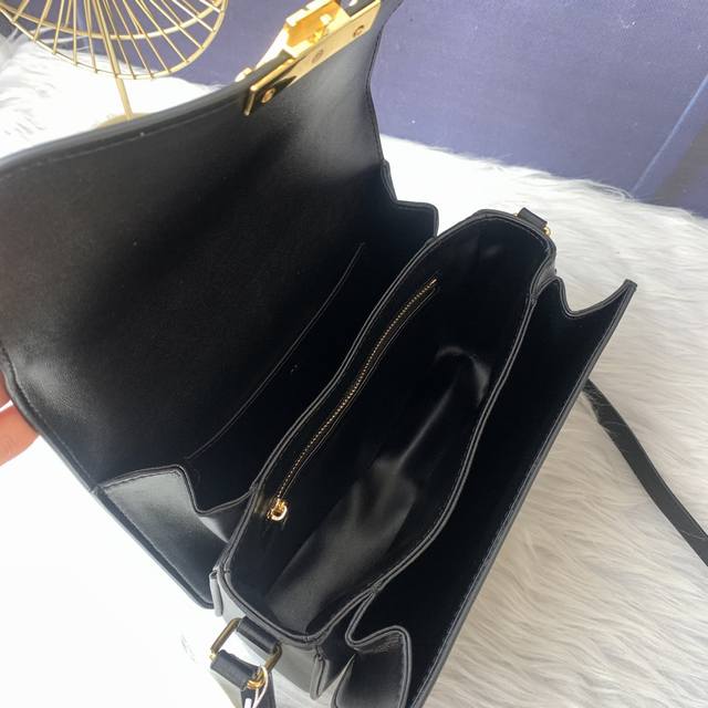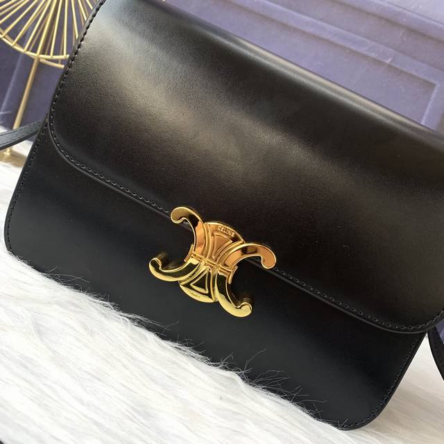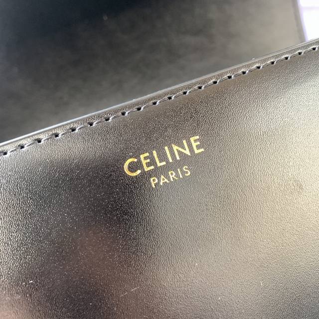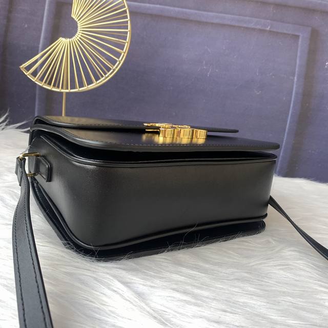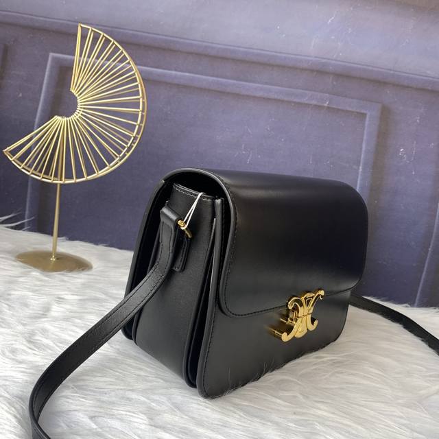 / 款号C188411黑色Triomphe大号手袋,附1条可调节及可拆卸皮革肩带和一个黄铜塔扣。金色金属件斜挎和肩背黄铜锁扣。尺寸22.5Cmx16.5Cmx7.5