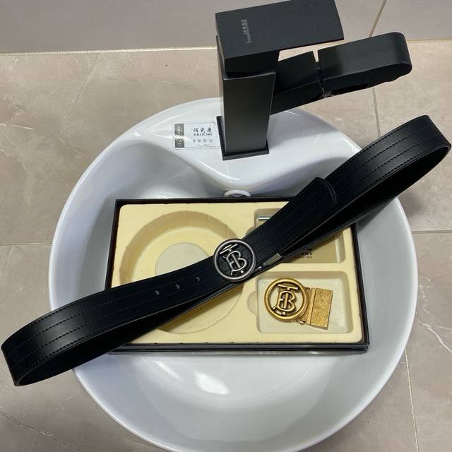 巴宝莉burberry精品款 新款自动扣 ☆双扣礼盒套装 含礼盒 专柜有售 巴宝莉burberry 专柜在售正品 此款采用头层牛皮制作 走线油边细致 正品开模 搭配广州原版扣经久耐用、3.5Cm规格 长度剪裁