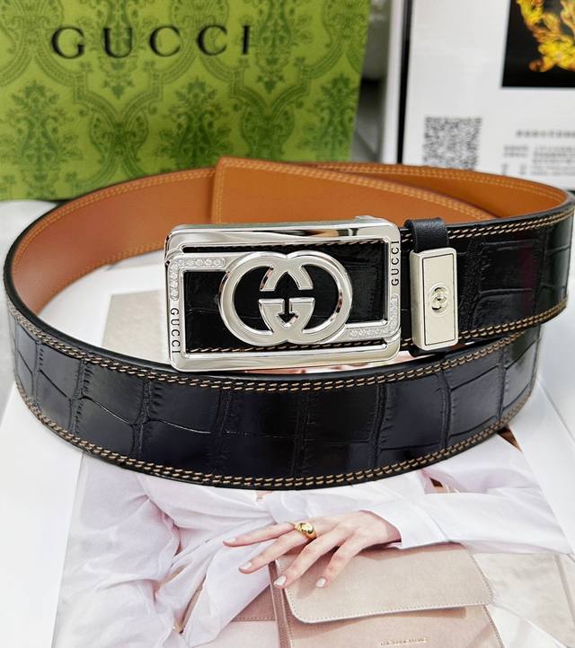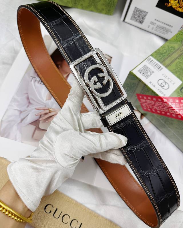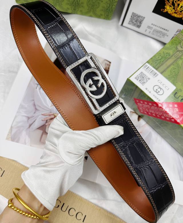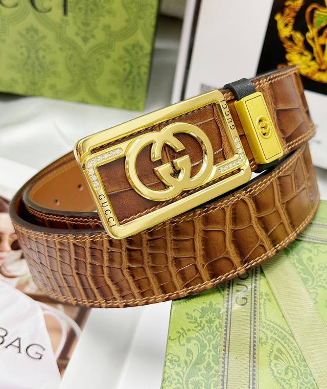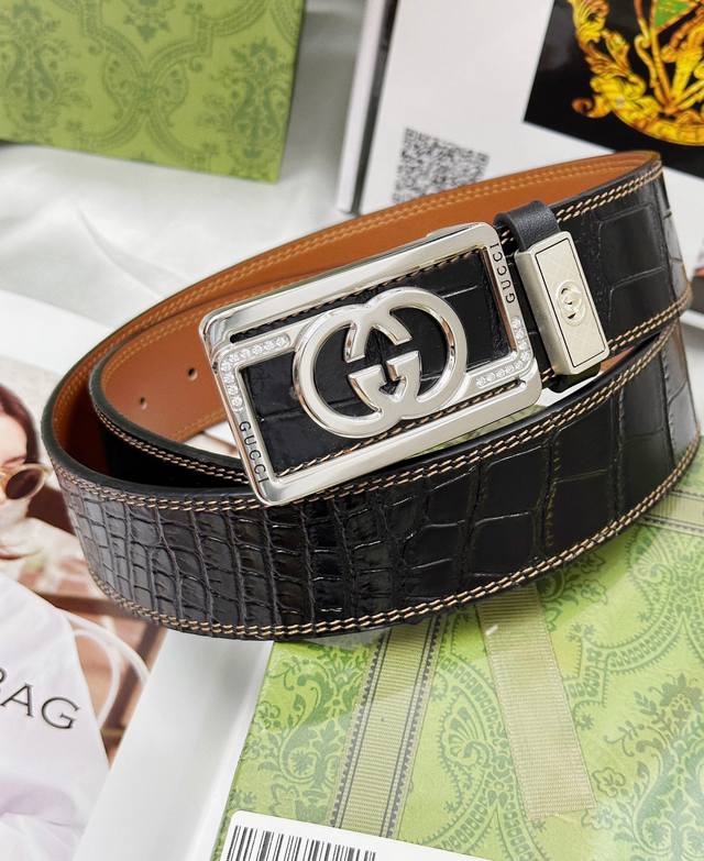 皮带:Gu..Cci..古琦顶级原单复刻. 腰带:百分百头层牛皮,保证真皮。雕花镂空镶钻石设计24K纯钢扣.永不掉色进口原厂鳄鱼皮纹路.纯手工双线缝制工艺双面两