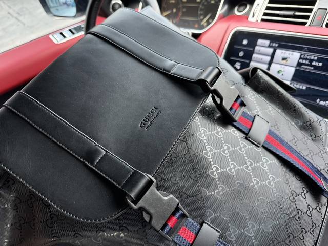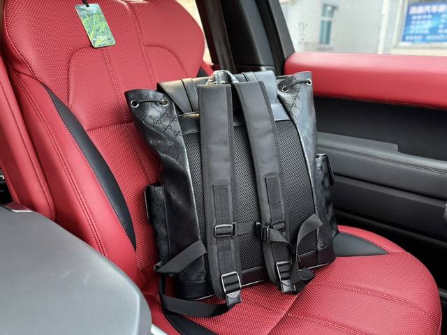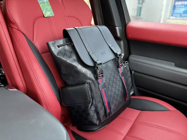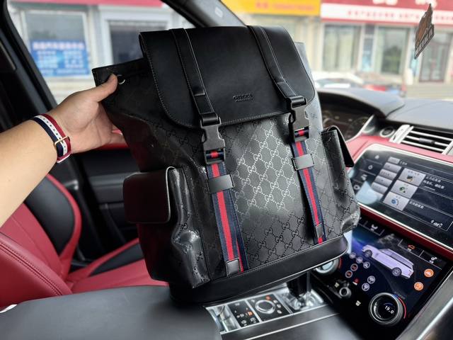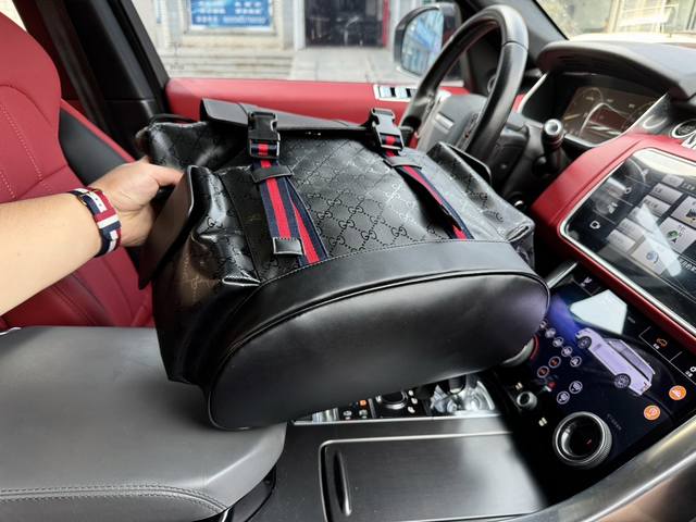 高端货 新款 “Gucci 古奇”双肩包男士 旅行双肩包 特别爆 明星同款gg图案采用醒目的黑 灰色组合,更搭配织带装饰肩带和黑色皮革滚边。采用柔软高级人造帆布