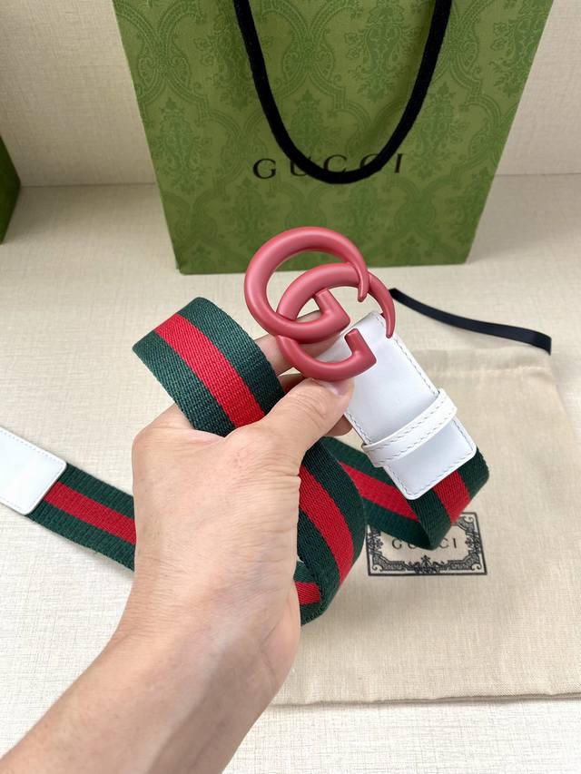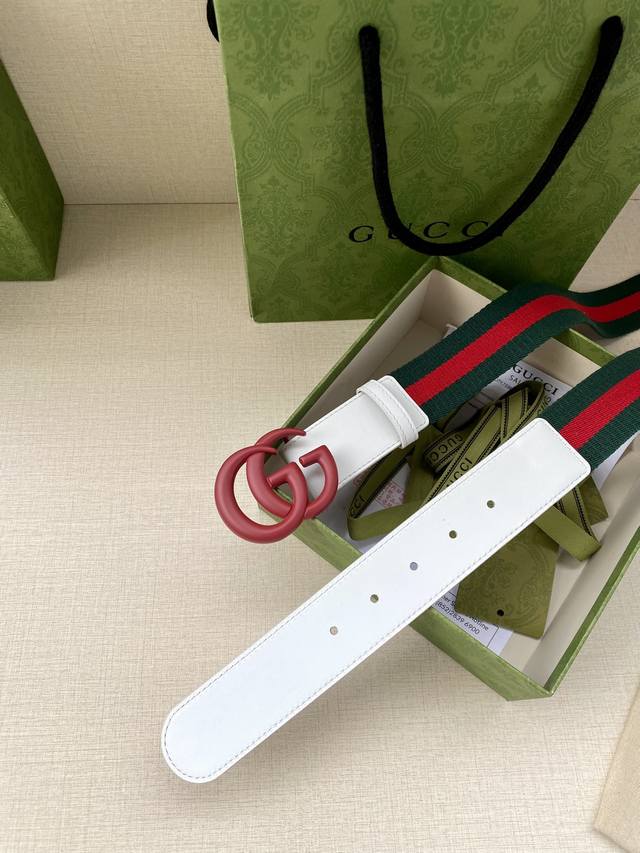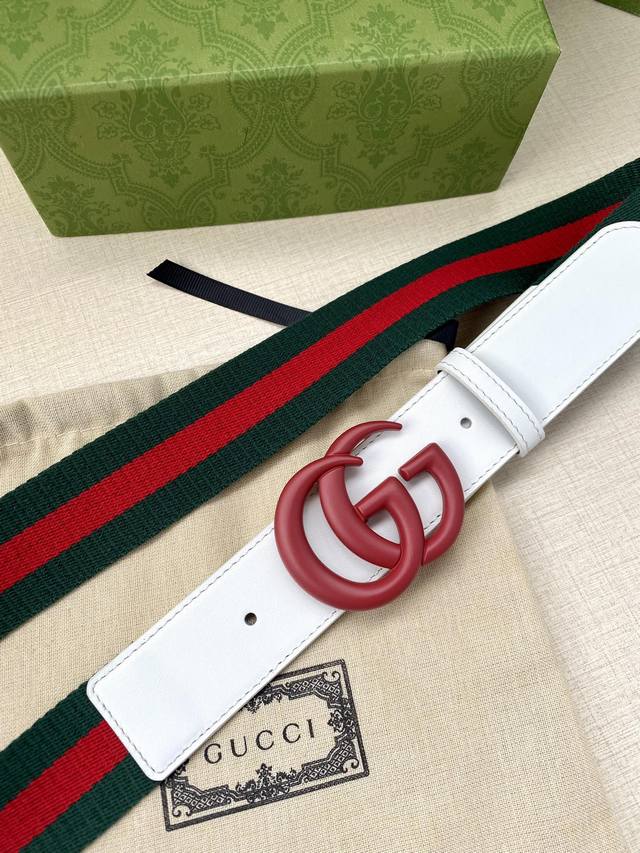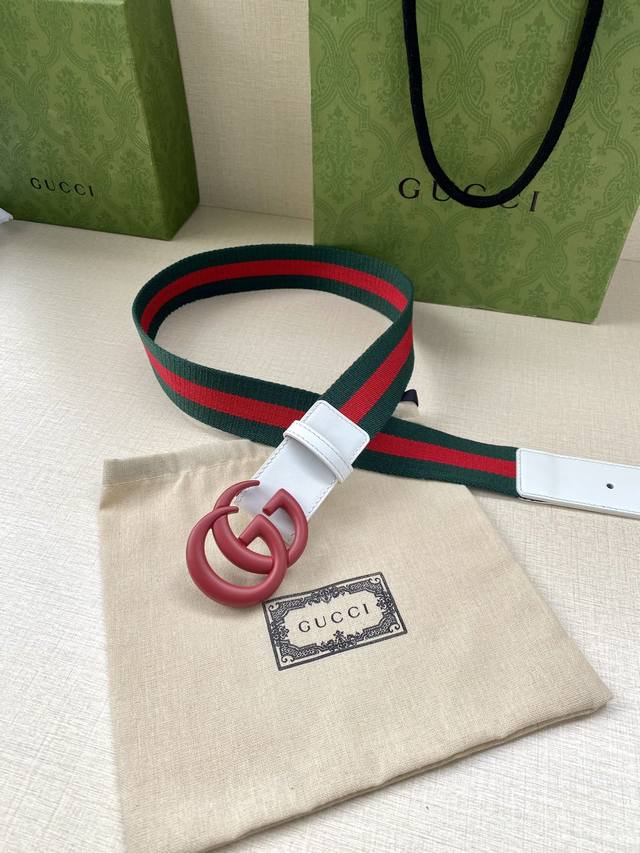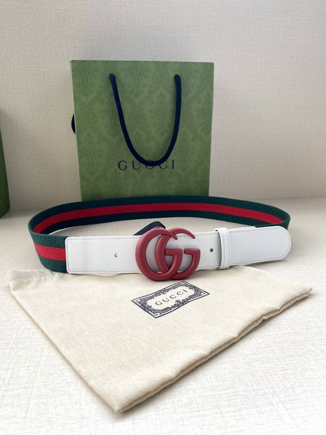 / 宽度4.0Cm Gucci 经典帆布织带腰带,配以织纹皮质滚边和双g原单扣配有绿色 红色 绿色棉质帆布编织腰带,配以白色头层牛皮