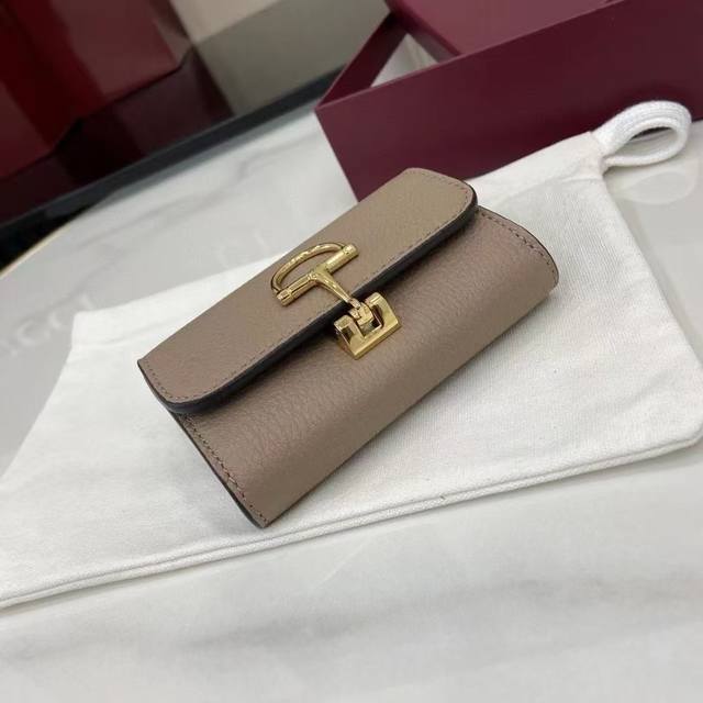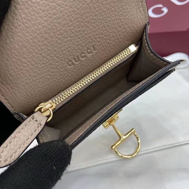 顶配版 新品 Gucci延续品牌深厚传承,深化与马术本源的联结。半马衔扣图案化身为开合细节,为多款小皮件增色添彩。这款卡片夹以灰粉色粒面牛皮革匠心打造,经典元素点缀其上。 DDD 灰粉色粒面牛皮革 DDD 浅金色调配件 DDD 半马衔扣 DDD 内部:一个拉链袋、一个平口袋、一个隔层 DDD 外部:一个开口袋 DDD 按扣开合 DDD 型号:828148。 DDD 尺寸:10.5厘米 宽 X 7厘米 高 X 3厘米 深 DDD 重量:约62克 DDD 颜色:灰粉色全皮。 DDD 意大利创作 DDD