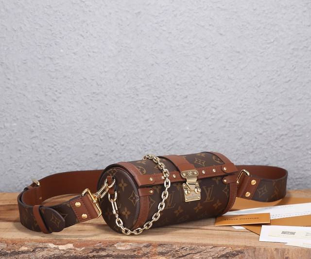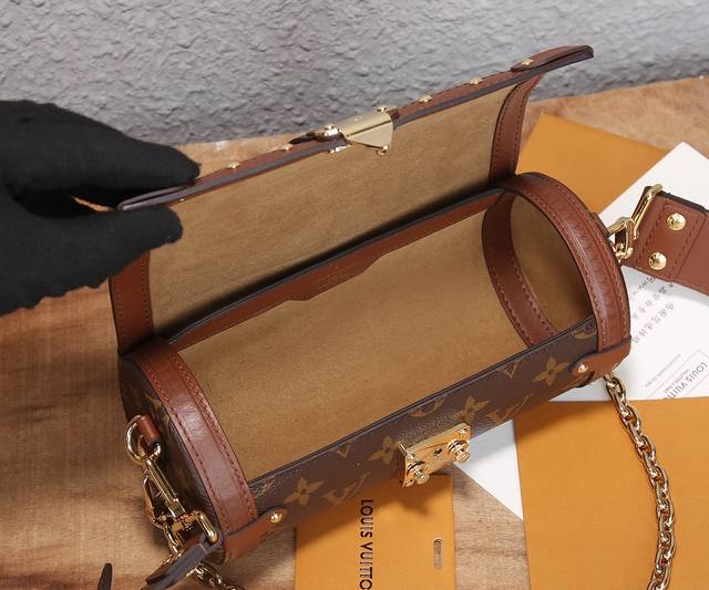 / 顶级原单全钢五金 Papillon Trunk 手袋点缀金属铆钉和 S-Lock 钩扣,为路易威登的传统格调注入当代风华。半硬质法棍包构型方便手持,亦可系上肩带