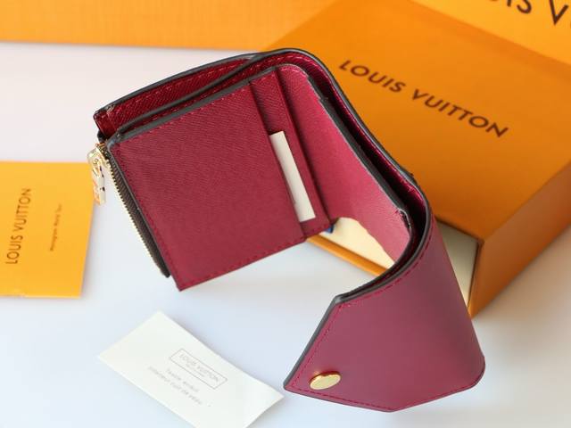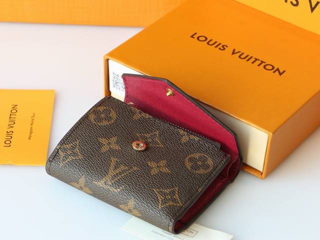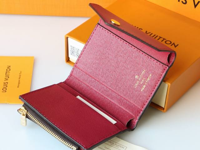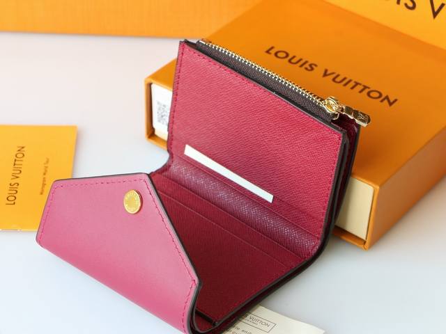 颜色 黑 紫红 粉 白格尺寸 9.5X7.5M62933Zoe 钱夹精巧的zoe钱夹:轻松收入任何小号包袋的尺寸,足以存放硬币、纸钞与信用卡的容量。 Monogram帆布搭配彩色皮革,一枚路易威登金色摁扣更显精致迷人