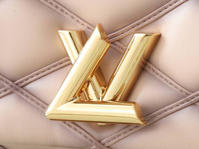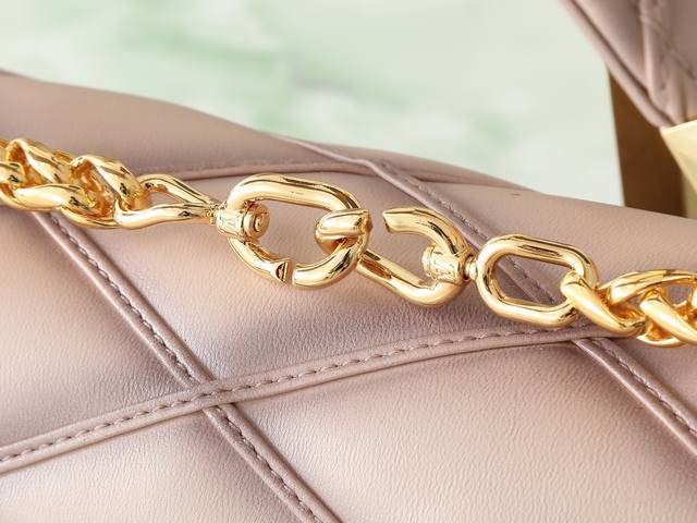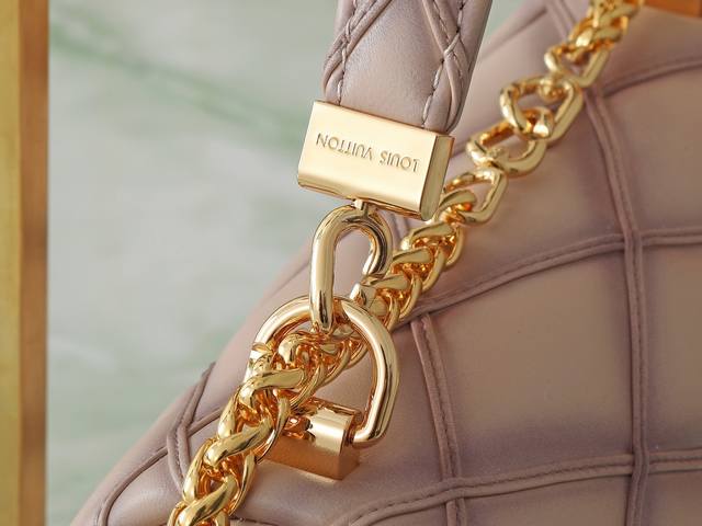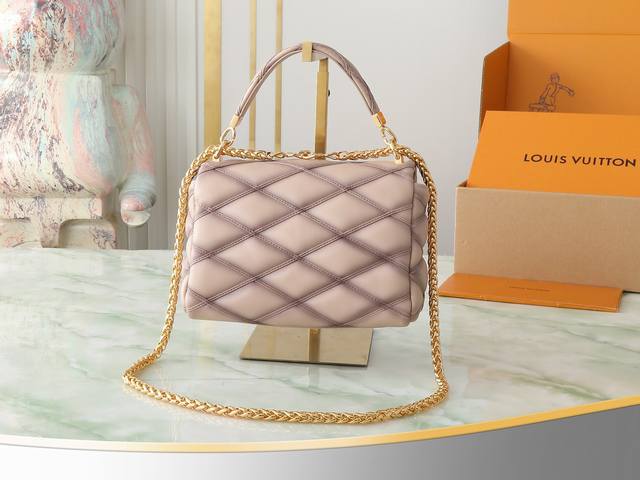 顶级原单 独家实拍 M23568 M22891杏粉 全皮菱格链条包系列 Go-14 Teist 中号手袋 M22890 本款 Go-14 中号手袋取材华美羊皮革,以绗缝图案致敬品牌传统行李箱设计。Lv Twist 扭锁彰显瞩目风范,顶部手柄可单独手提,亦可化为滑链肩带的皮革肩垫,实现舒适肩背或斜挎体验。尺寸:23 X 16 X 10 厘米。