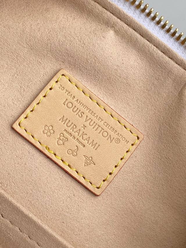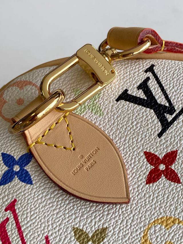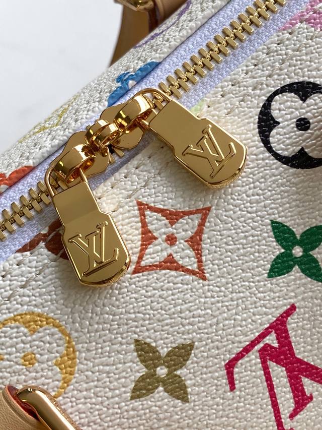 本款 M13085 Speedy BandoulièRe 25 手袋为经典 Monogram 图案渲染日本艺术家村上隆笔下的明丽色调,与蝴蝶结造型钥匙包一道彰显路易威登 X 村上隆合作系列的灵动风采。牛皮革塑造 Toron 手柄和可拆卸并调节的肩带,耀目挂锁和包角援引品牌行李箱元素。尺寸:25×19×15Cm