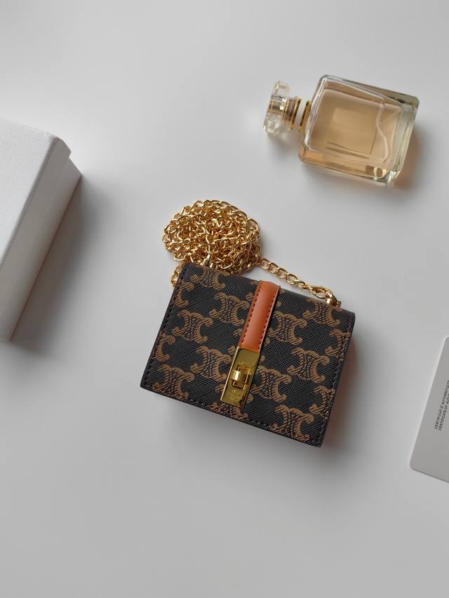 Celine最新链条卡包,Triomphe翻盖链条卡包,可斜挎,经典花纹内配平纹超纤,旋转锁扣开合,1个加厚主隔层,2个内侧卡槽。