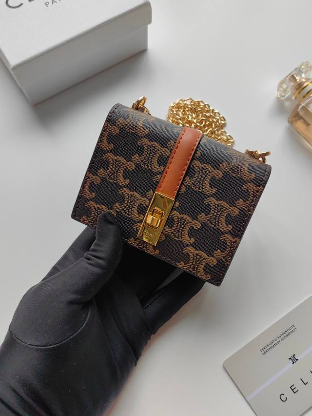 Celine最新链条卡包,Triomphe翻盖链条卡包,可斜挎,经典花纹内配平纹超纤,旋转锁扣开合,1个加厚主隔层,2个内侧卡槽。 编号:10M472 尺寸:1