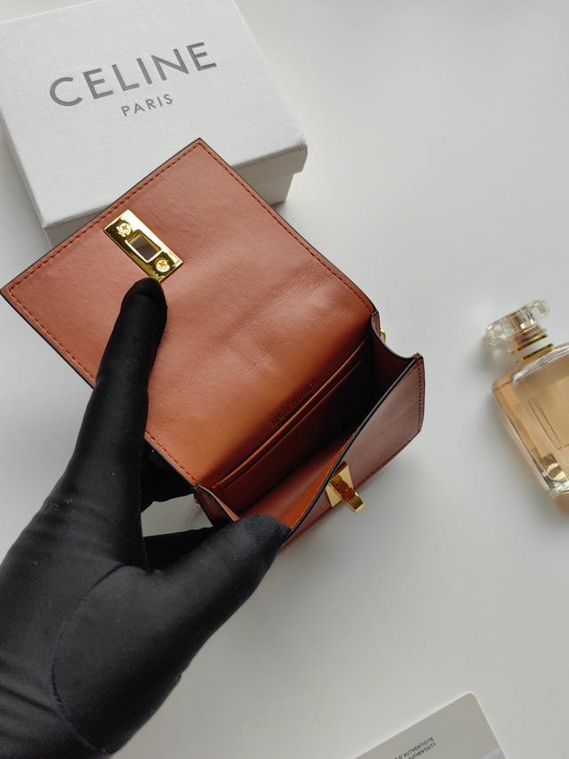 / Celine最新链条卡包,Triomphe翻盖链条卡包,可斜挎,经典花纹内配平纹超纤,旋转锁扣开合,1个加厚主隔层,2个内侧卡槽。 编号:10M472 尺寸:1