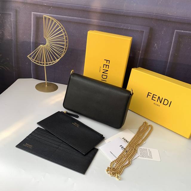 型号:F8Bs032 芬迪黑色。 尺寸21.5X13X3Cm介绍:几何图形翻盖迷你手袋,饰有Fendi微标,按扣开合,配两个可拆式内袋--一个带拉链,一个带8个卡槽,可拆卸链式肩带,内籿配有平口袋。