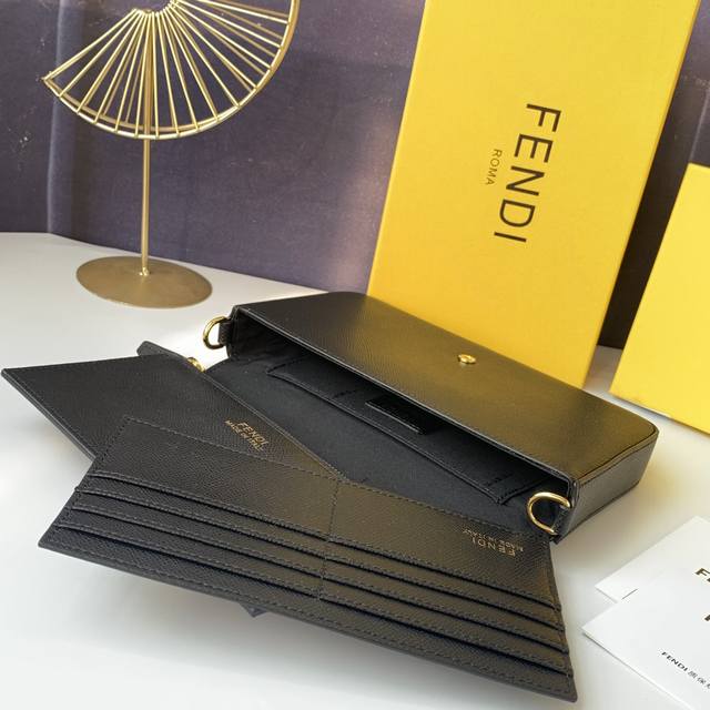 款号F8No152 带几何形翻盖的F Is Fendi大号修长款手拿包。按扣开合,黑色手掌纹Cruise皮革材质,金色金属件。尺寸:23Cmx17Cmx1Cm