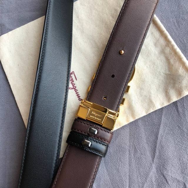 Salvatore Ferragamo菲拉格慕男士3.5Cm新款菱形切面金属夹扣,进口头层牛皮可双面外用!