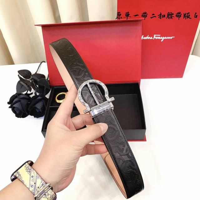 p 240菲拉格慕 原单双面进口小牛皮带身.正反两面可用,一面黑色 一面咖啡 搭配原单精品钢扣。原产皮料定制,专柜宽度3.5Cm....