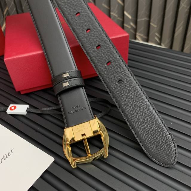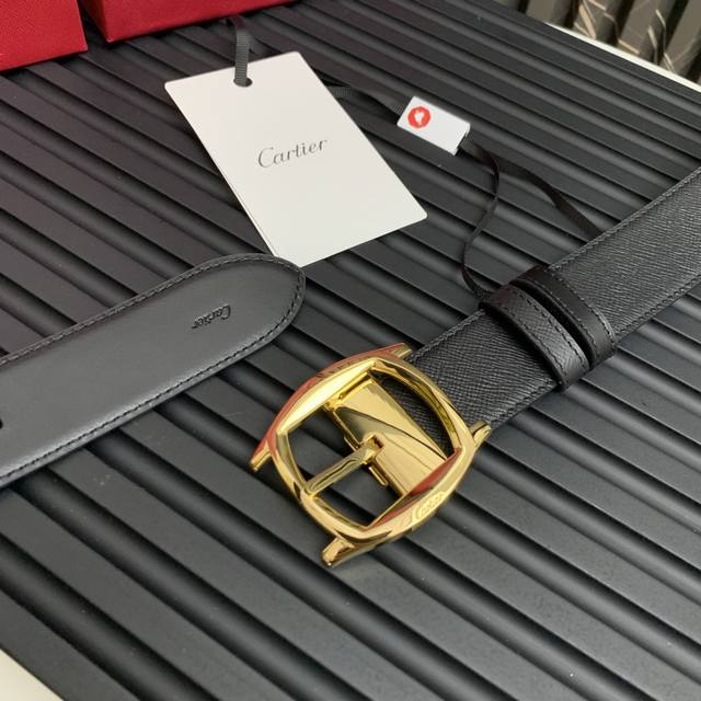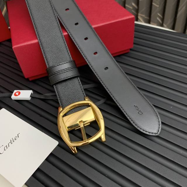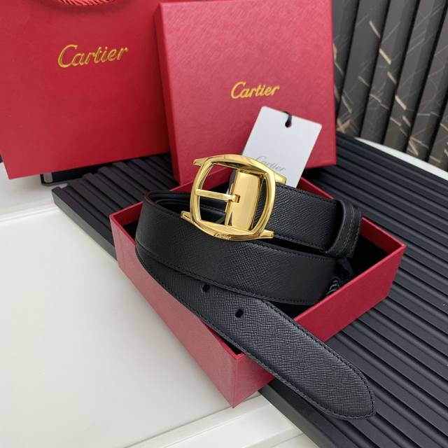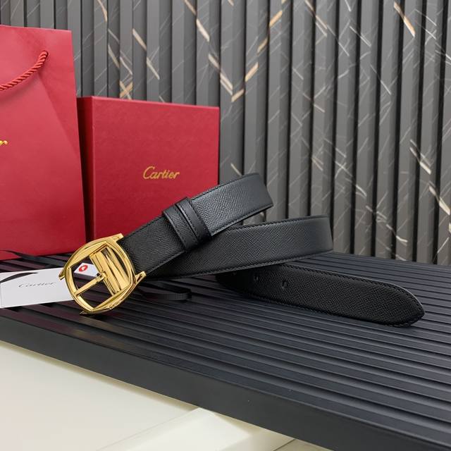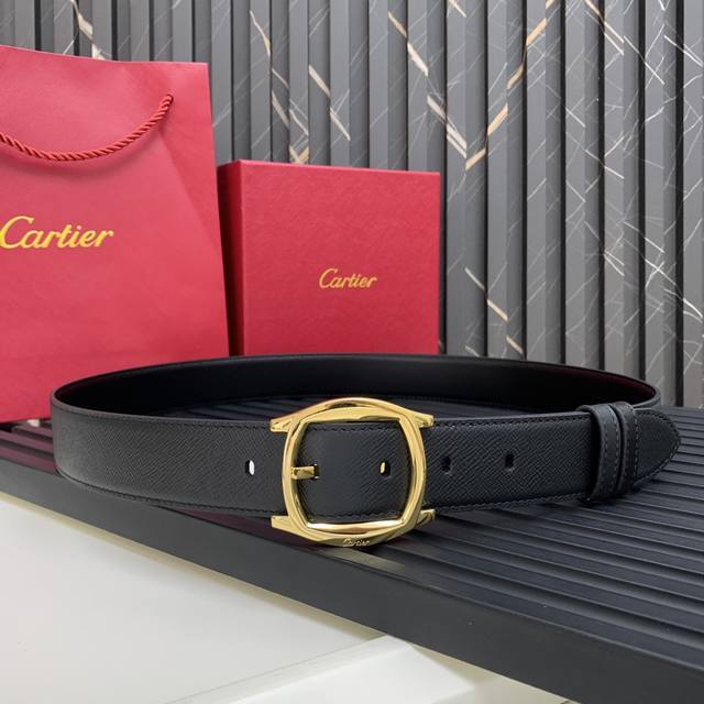 镀钯饰面针扣式皮带,Cartier标志。黑色与棕色牛皮双面皮带,浮雕“Cartier”标志。尺寸:宽35毫米 可调节