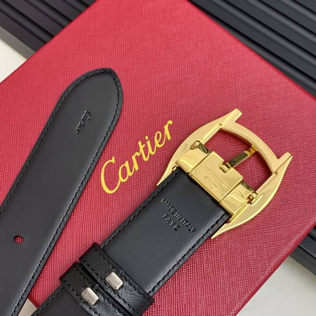 卡地亚针扣式皮带,Cartier标志。黑色与棕色牛皮双面皮带,浮雕“Cartier”标志。尺寸:宽35毫米 可调节