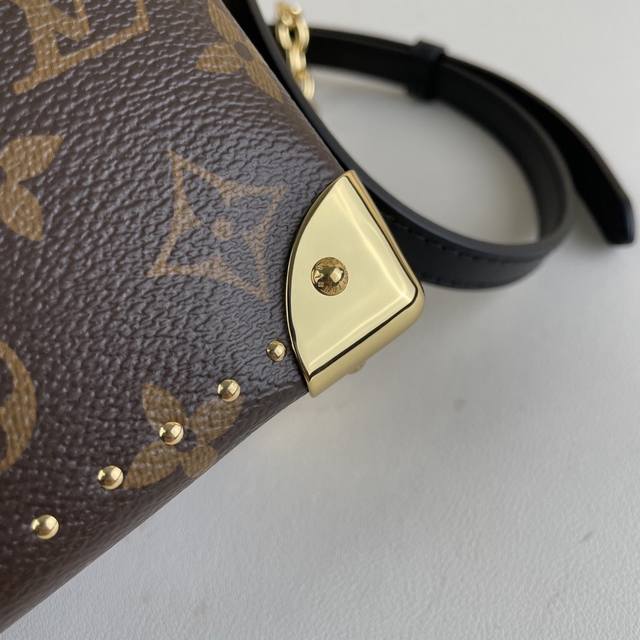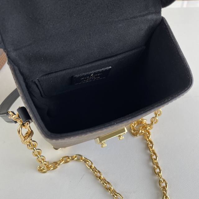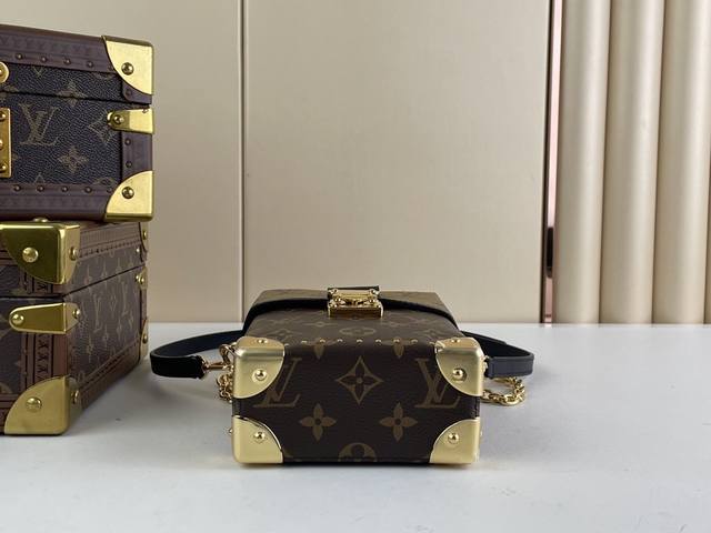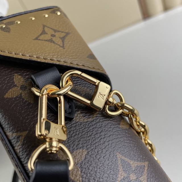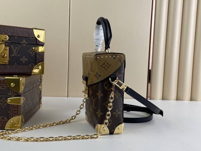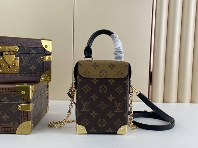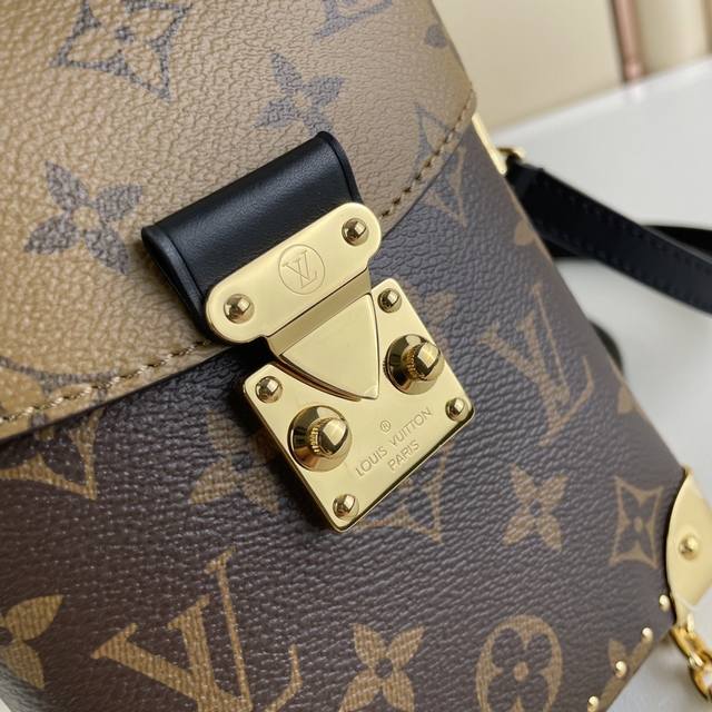 本款 Camera Box 手袋以 Monogram 和 Monogram Reverse 帆布塑造摩登构型,融合 S-Lock 锁扣,金属包角和饰钉等 Petite Malle 手袋的标志性细节。纤细链条彰显柔美格调,顶部手柄再添舒适背携方式。
