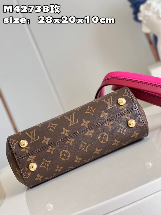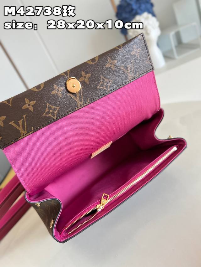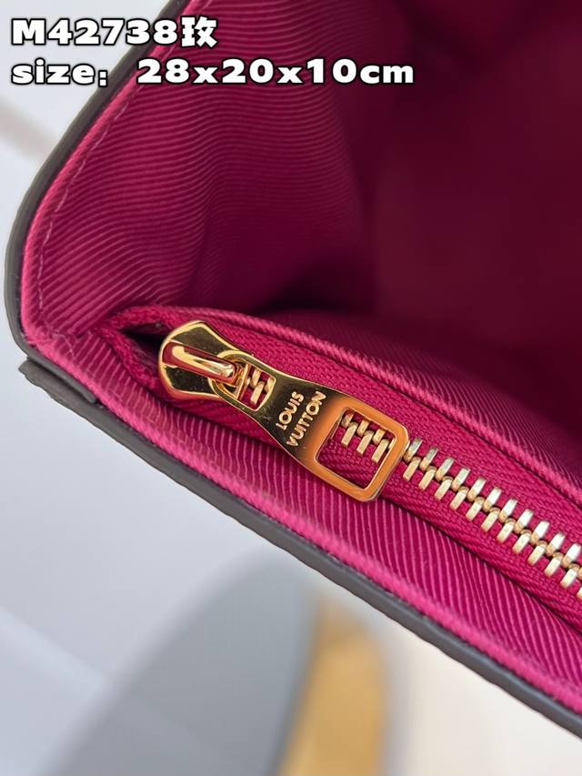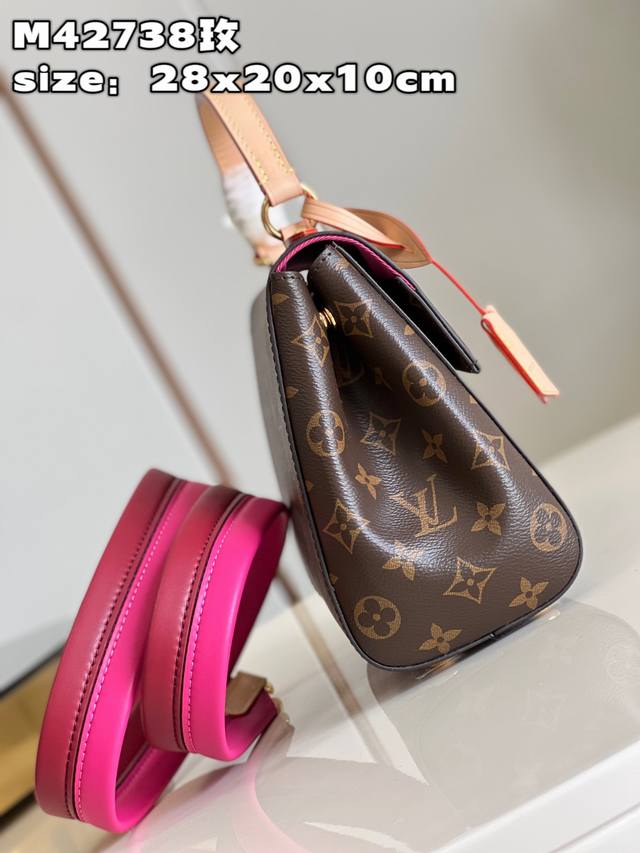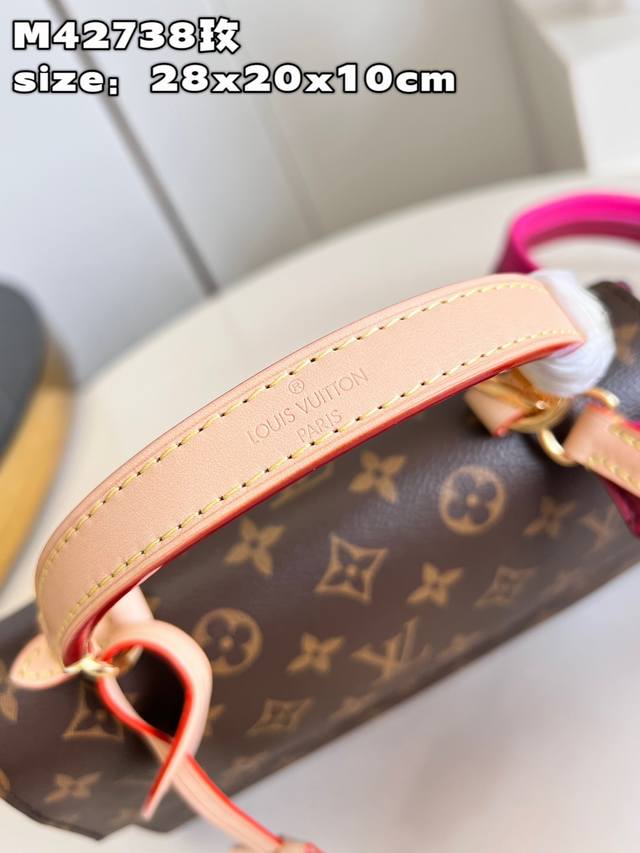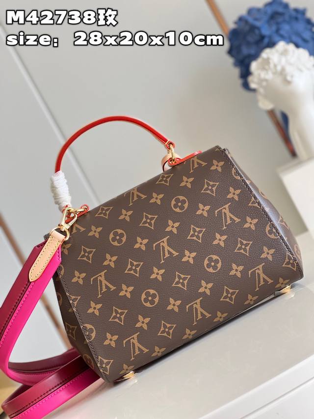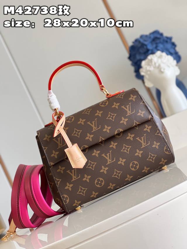 M42738玫 本款 Cluny Bb 手袋取材经典 Monogram 帆布,专为繁忙生活而设计。宽大开口下设考究内里,便于拿取物品。磁吸翻盖与拉链内袋确保物品安全无虞。多彩皮革肩带实现斜挎,增添盎然活力;顶部手柄实现优雅手提。Size:28X20X10Cm S