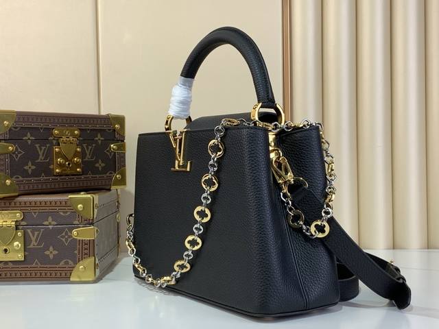 本款 Capucines 中号手袋出自 Chain On You 系列,以 Taurillon 牛皮革聚焦品牌匠心巧思与精良工艺。珠宝风格双镀链条点缀 Monogram 花卉,圆润 Lv 字母和金属件再添考究笔触。无论斜挎、手提或肩背,均可展露优雅格调。