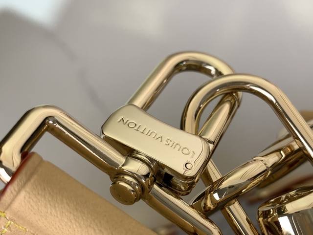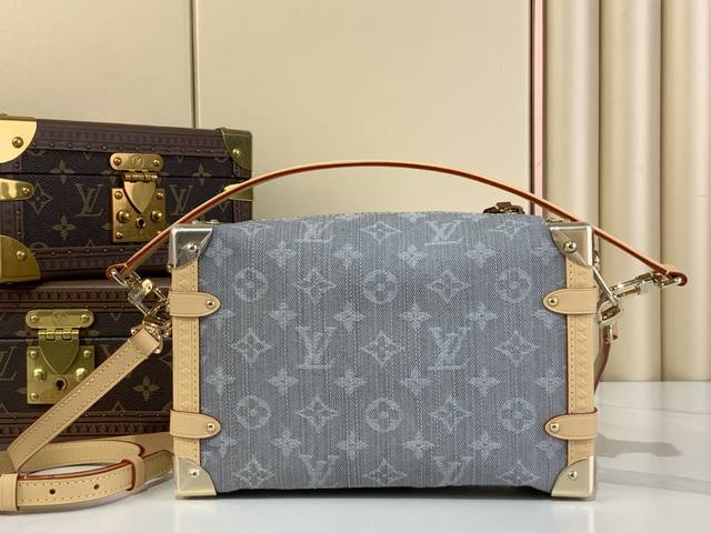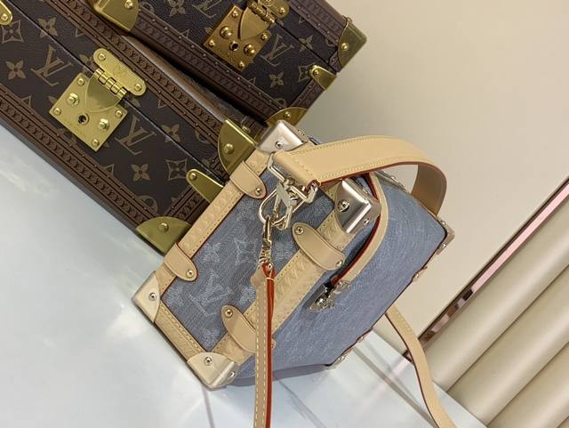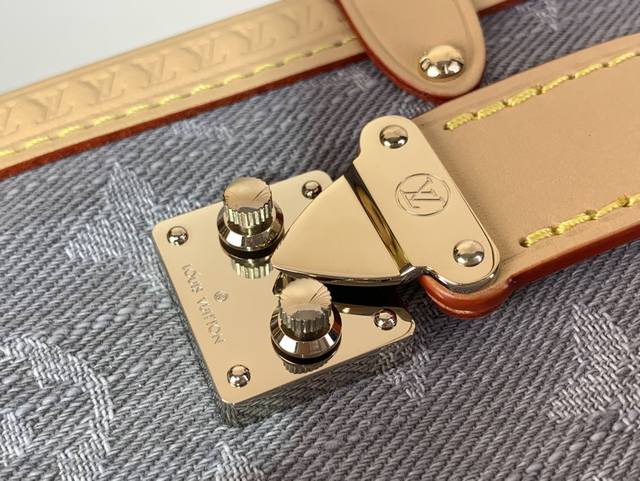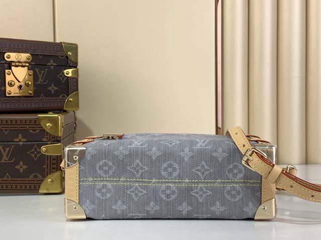 以 Louis Vuitton 的复古行李箱为灵感 以独特的漂白饰面重新演绎 2005 年的 Monogram Denim 图案 它点缀着浅金色五金件 包括以树干为灵感的边角 并饰有对比鲜明的皮革边饰 时尚的设计采用标志性的 S 形锁扣 其大小可存放日常必需品