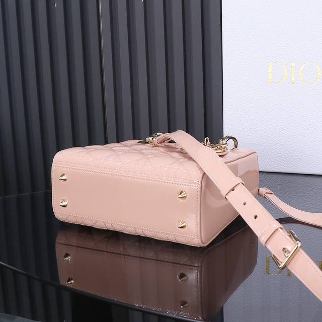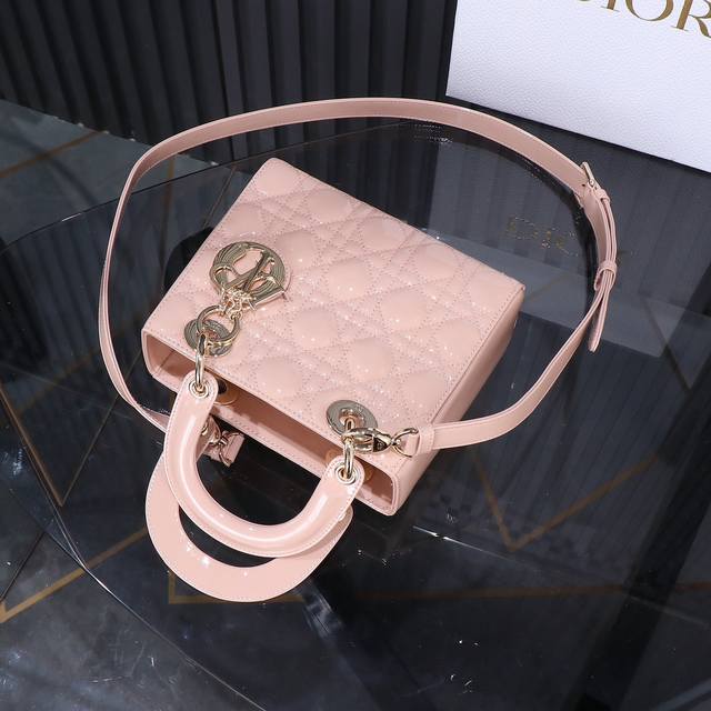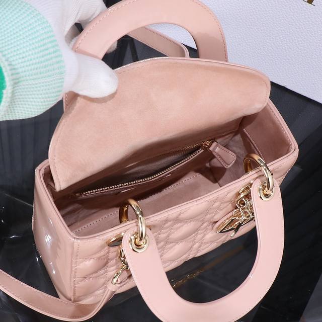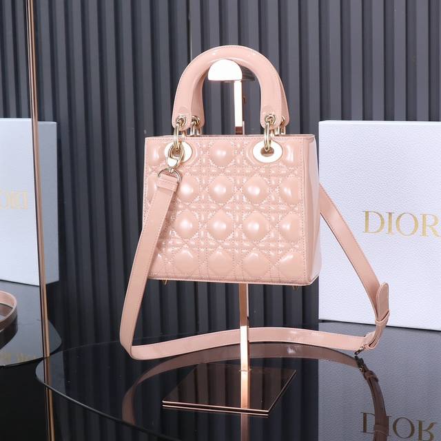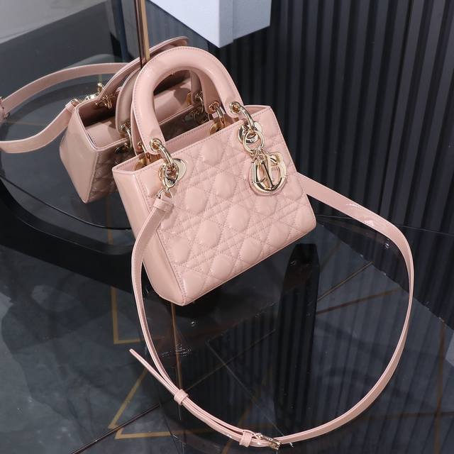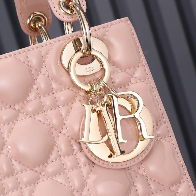 / 原厂皮 Lady Dior 四格粉色漆皮,经典款戴妃包手袋集中体现了 Dior 对典雅和美丽的深刻洞见。精心制作,以藤格纹缉面线打造醒目的绗缝细节,高雅经典的设