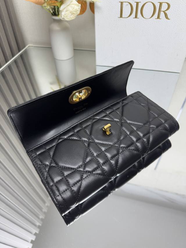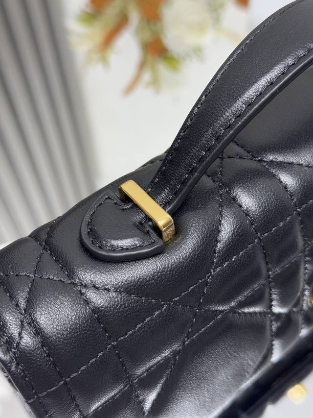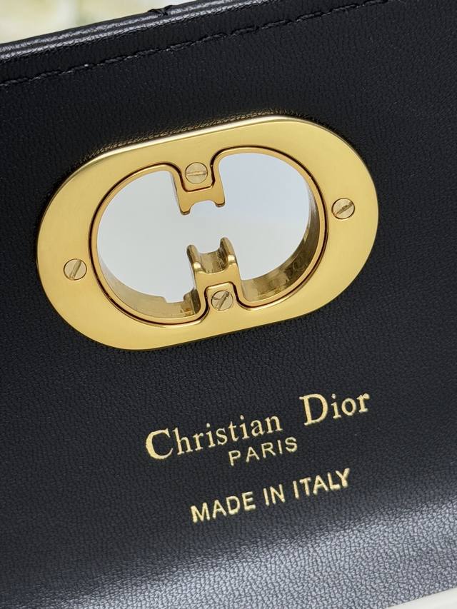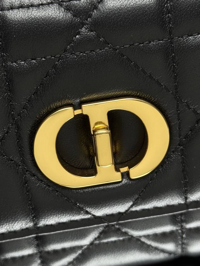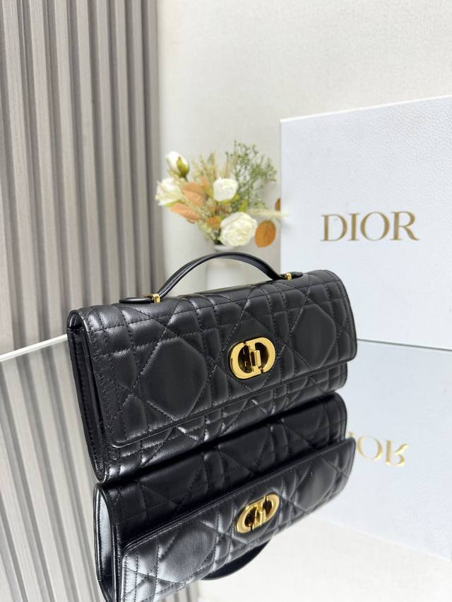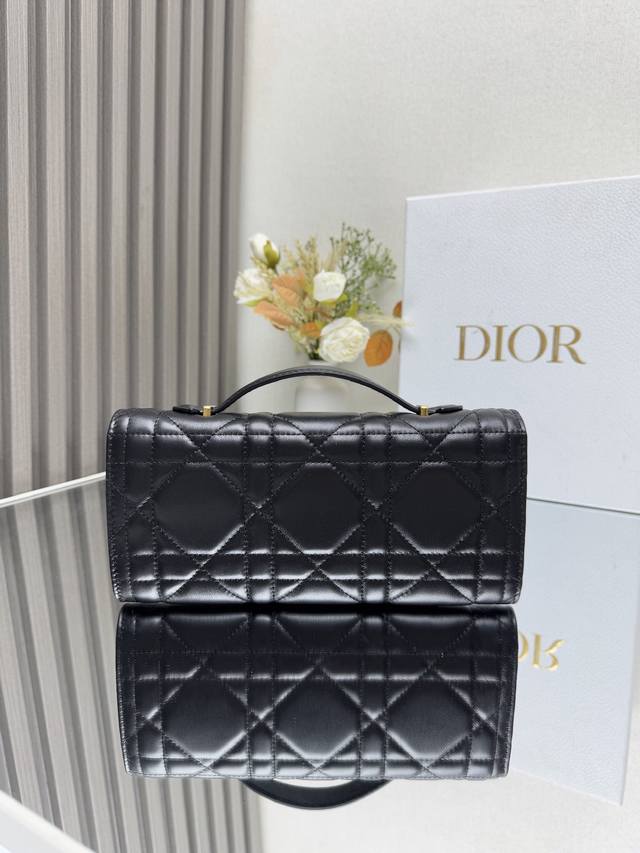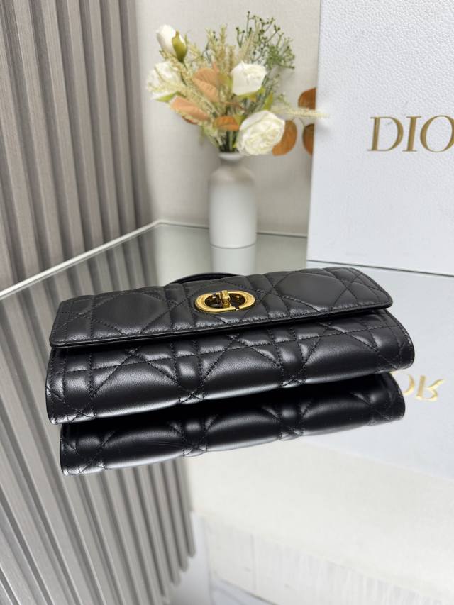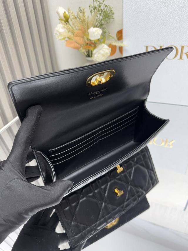 这款 Miss Caro Top Handle 手拿包是二零二五早春系列新品,是一款彰显精致魅力的日常单品。采用黑色羊皮革精心制作,饰以超大藤格纹缉面线,翻盖饰以复古金色饰面金属旋钮式 Cd 扣环,灵感源自 Christian Dior 香水瓶的封口,搭配一个隔层,可收纳各种日常用品。搭配可折叠的顶部手柄,可手提,提升精致外观。