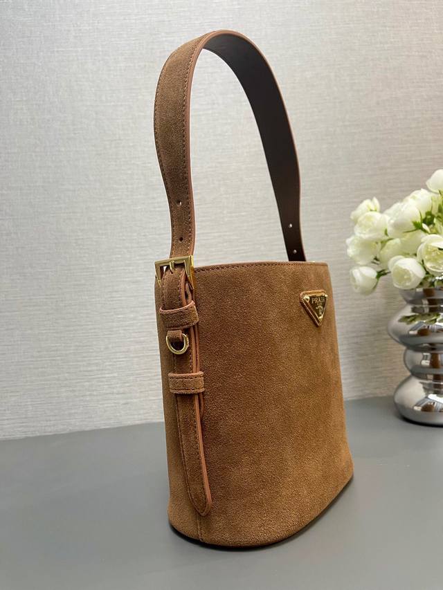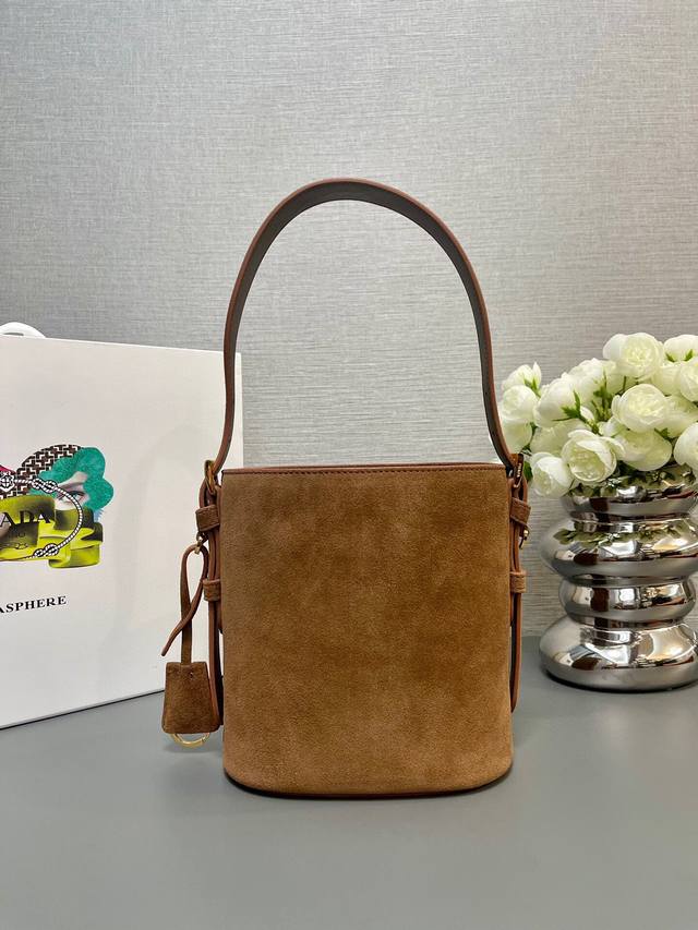 / 厂价 。 最高版本原厂皮顶级原单配专柜全套包装 顶级原单 新款水桶包1Be078鹿绒皮小号這款靈活易搭的水桶袋設計極簡,以柔軟的麂皮製作。肩带可调节,内配进口羊
